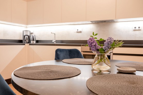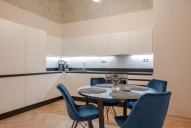 Byt se nabízí nezařízený a skládá se z předsíně, kuchyně, obývacího pokoje se vstupem na balkon, ložnice a 2 koupelen (jedna se sprchou, druhá s vanou, každá s toaletou, umyvadlem a topným žebříkem), je dále vybaven kuchyňskou linkou se spotřebiči (myčka, lednice, mrazák, varná deska, pečící trouba. digestoř) a 2 velkorysými vestavěnými skříněmi. Architektonickým šperkem je vestavěný kontejner.