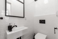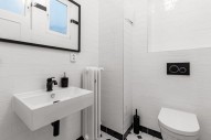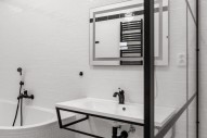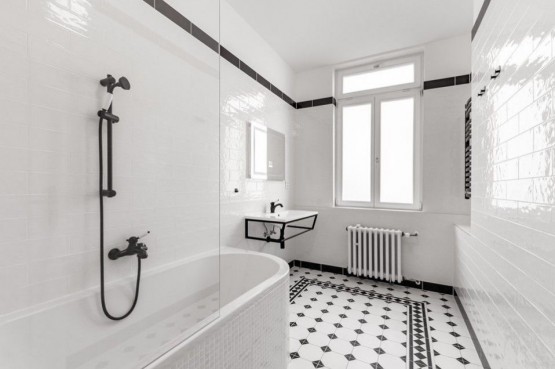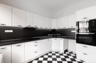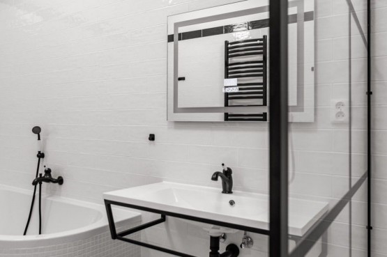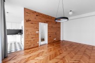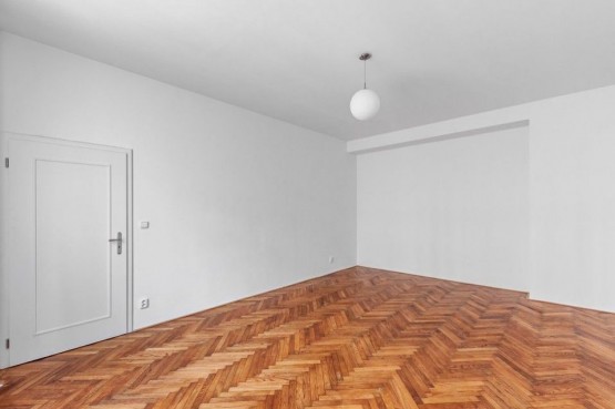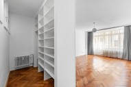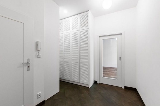 se samostatnou kuchyní s oknem a kuchyňským koutem a přímým vstupem na balkon, další prostorný pokoj, velkorysá šatna s možností případného využití jako kanceláře, pracovny. Zrenovovaná velká koupelna s vanou, sprchovým koutem, samostatná toaleta zvlášť. Předsíň se zabudovanými šatními skříněmi zhotovené na míru.