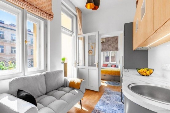 PRONAJATO Exkluzivně nabízíme k dlouhodobému pronájmu unikátně řešený luxusní byt 2+kk 35m2 s balkonem 7m2 v neorenesančním domě Steffany's Court ve Štěpáns...ké ulici.