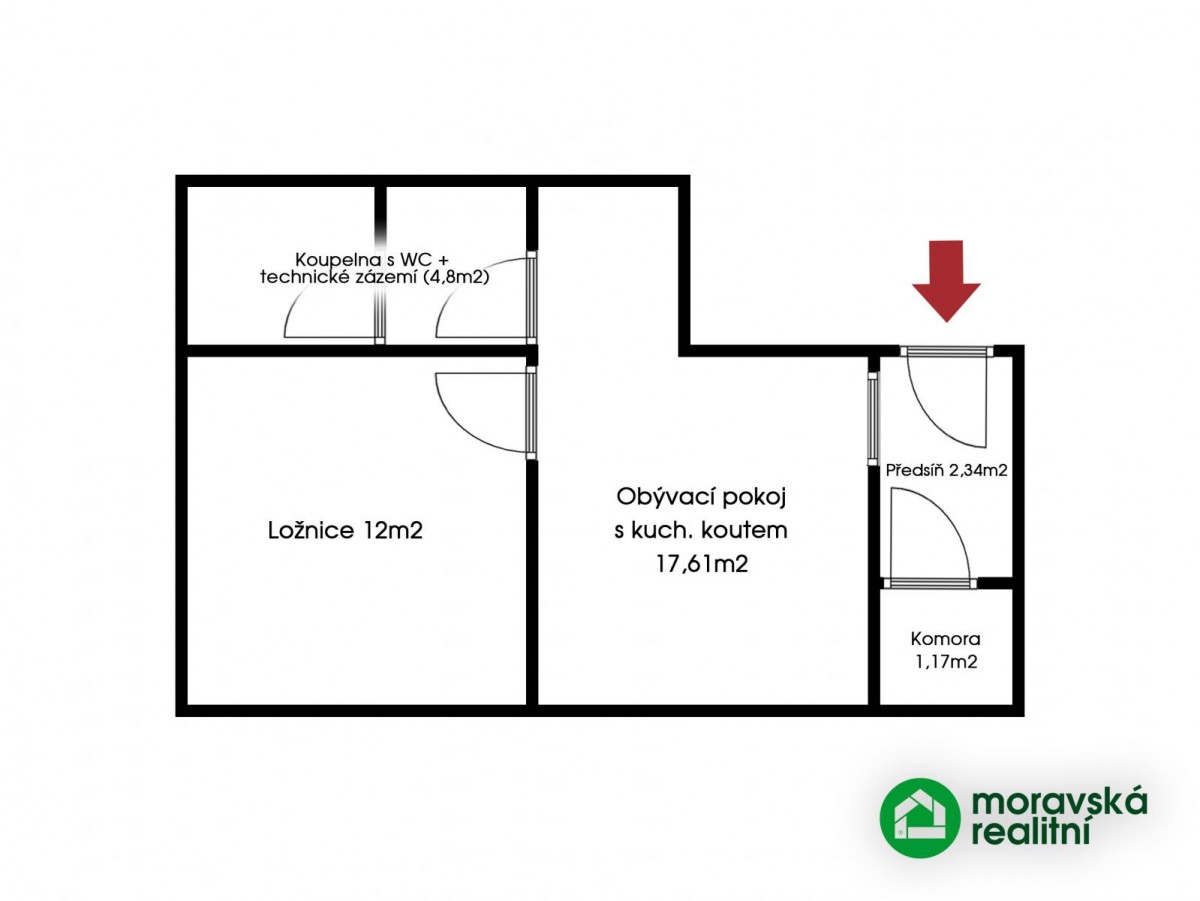 Dispozice: Předsíň (2, 34m2), obývací pokoj s kuch. koutem (17, 61m2), ložnice (12m2), koupelna s sociální zařízení WC + technické zázemí (4, 8m2), komora (1, 17m2).