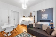 Vybavení zahrnuje : kompletně vybavená kuchyňská linka, mikrovlna trouba s grilem, lednice, myčka, TV, původní špaletová okna, vysoké stropy, parketová podlaha, v koupelnách dlažba.