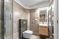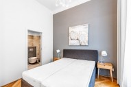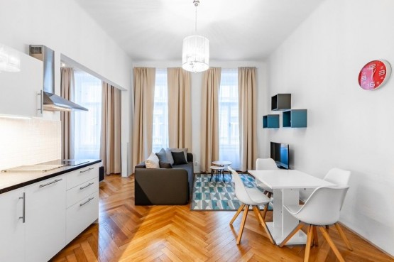 Vybavení zahrnuje : kompletně vybavená kuchyňská linka, mikrovlna trouba s grilem, lednice, myčka, TV, původní špaletová okna, vysoké stropy, parketová podlaha, v koupelnách dlažba.