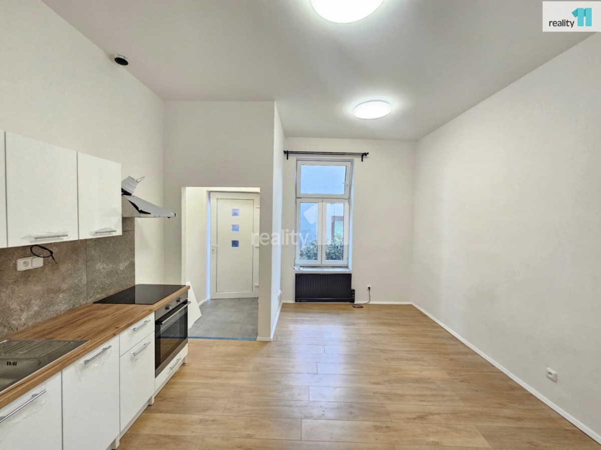 V místnosti kde je kuchyňská linka je velké francouzské okno se vstupem do vnitrobloku a druhá samostatná místnost je vhodná jako ložnice.