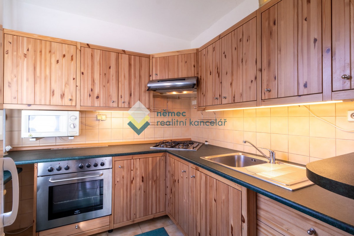 Byt je částečně vybavený - tv stolkem, sedačkou, jídelním stolkem i množstvím úložných prostor. Kuchyňská linka disponuje mikrovlnnou troubou, plynovým sporákem, troubou i lednicí.