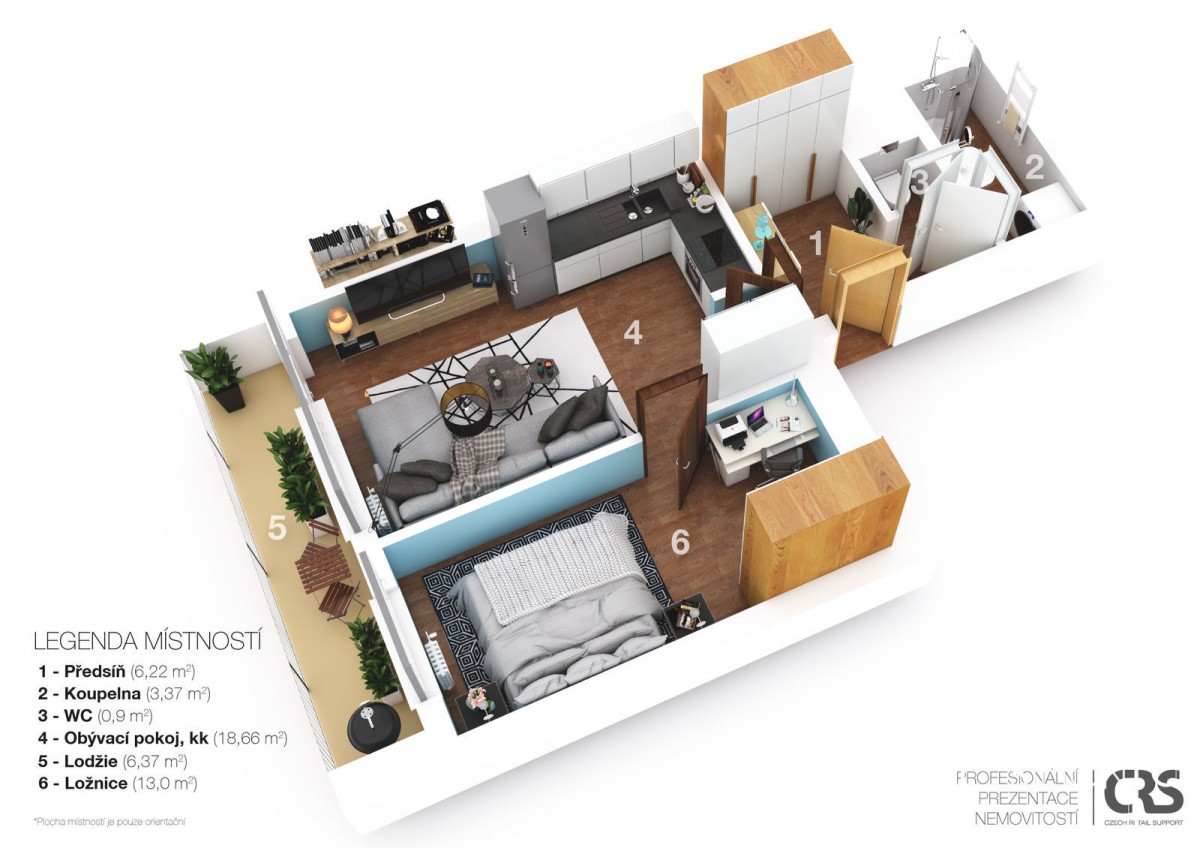 Byt má rozlohu s dispozicí 2+kk 42 m2 + zasklená lodžie 6 m2 + sklep 1, 5 m2.