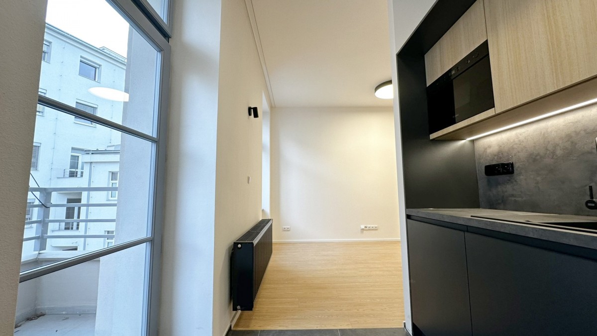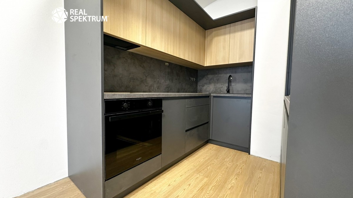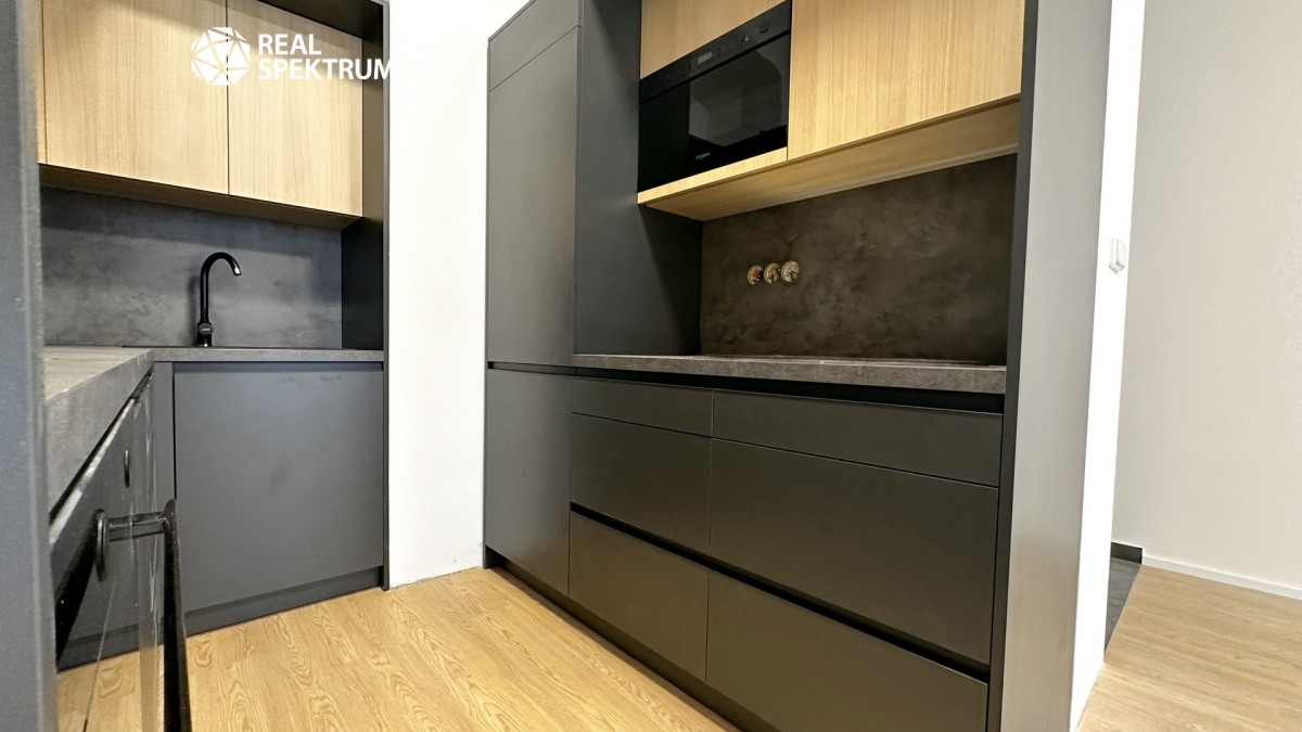 Apartmán se pronajímá částečně vybavený – k dispozici je nová kuchyňská linka s elegantní kombinací černé a dřeva, včetně spotřebičů (myčka, lednice, varná deska, trouba, mikrovlnka). Obytný prostor působí vzdušně díky vysokým oknům a světlým podlahám. Koupelna je moderní a prostorná – sprchový kout, umyvadlová skříňka, toaleta a pračka.