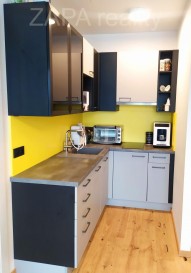 Je kompletně nově zařízený - kuch. linka s vest. spotřebiči - myčka a sklokeramická varná deska, dále pračka se sušičkou, lednice, stolní elektrická trouba, sedací souprava, jídelní stůl se židlemi, TV a šatní skříň s psacím stolem v ložnici, v předsíni je videotelefon pro otevírání vchodových dveří.
