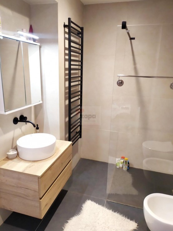 V místnostech jsou moc hezké dubové podlahy, v koupelně je velkoformátová dlažba, topení je v celém bytě podlahové, vytápění zajišťuje tepelné čerpadlo s rekuperací. Na terase jsou dřevěná terasová prkna.