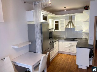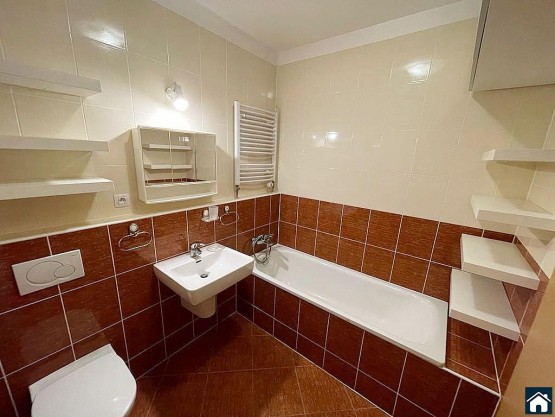 Kuchyně j...e plně vybavena spotřebiči - sklokeramická deska, horkovzdušná trouba lednice, myčka a mikrovlnná trouba. Koupelna je zařízena vanou, je společná s sociální zařízení WC a je zde k dispozici pračka. Byt má spoustu úložného prostoru včetně komory v bytě.