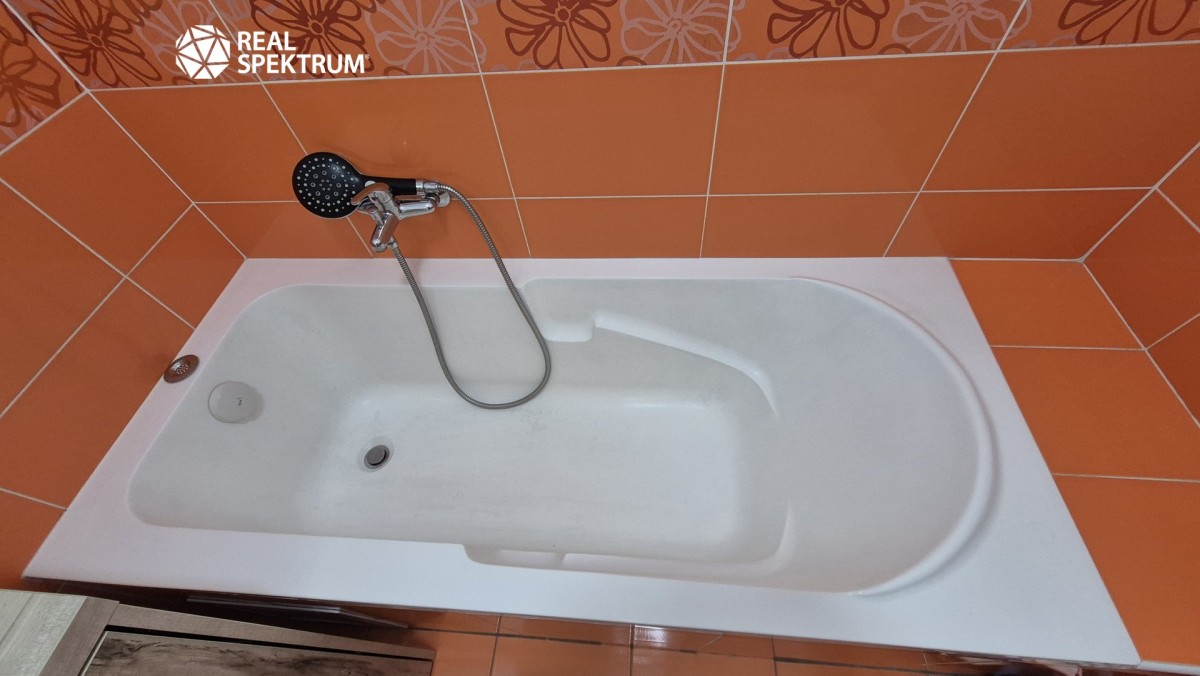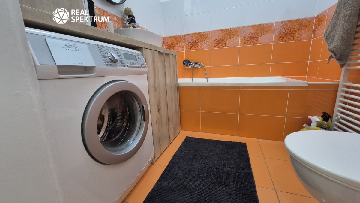 Koupelna nabízí vanu, pračku, umyvadlo a toaletu. Další úložné prostory se nachází v chodbě bytu.