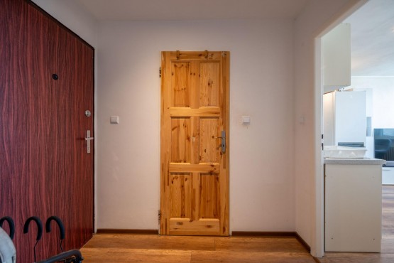 Námi nabízený byt se skládá z předsíně, obývacího pokoje s kuchyňským koutem a vstupem na první lodžii, dále z ložnice se vstupem na druhou lodžii, šatny a koupelny (vana, umyvadlo, zrcadlová skříňka, toaleta, přípojka na pračku). Kuchyňská linka je vybavena spotřebiči: pečící trouba, varná deska, myčka a volně stojící lednice s mrazákem. Ústřední vytápění.