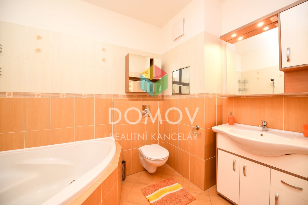 Dále se v bytě nachází ložnice se vstupem na lodžii. Prostorná koupelna s vanou je zařízena umyvadlem se zrcadlem, pračkou, topným žebříkem, sociální zařízení WC a dostatkem místa pro vše potřebné.
