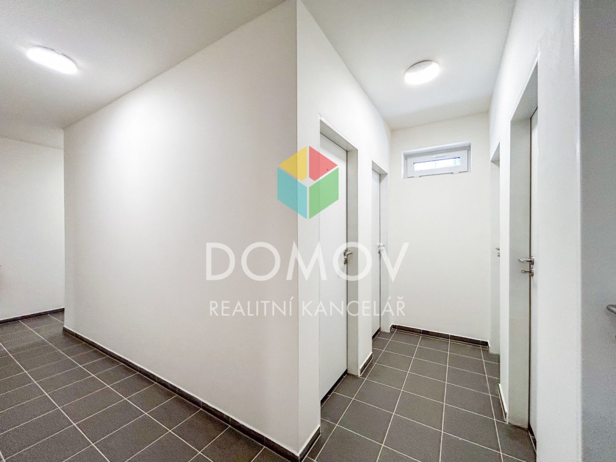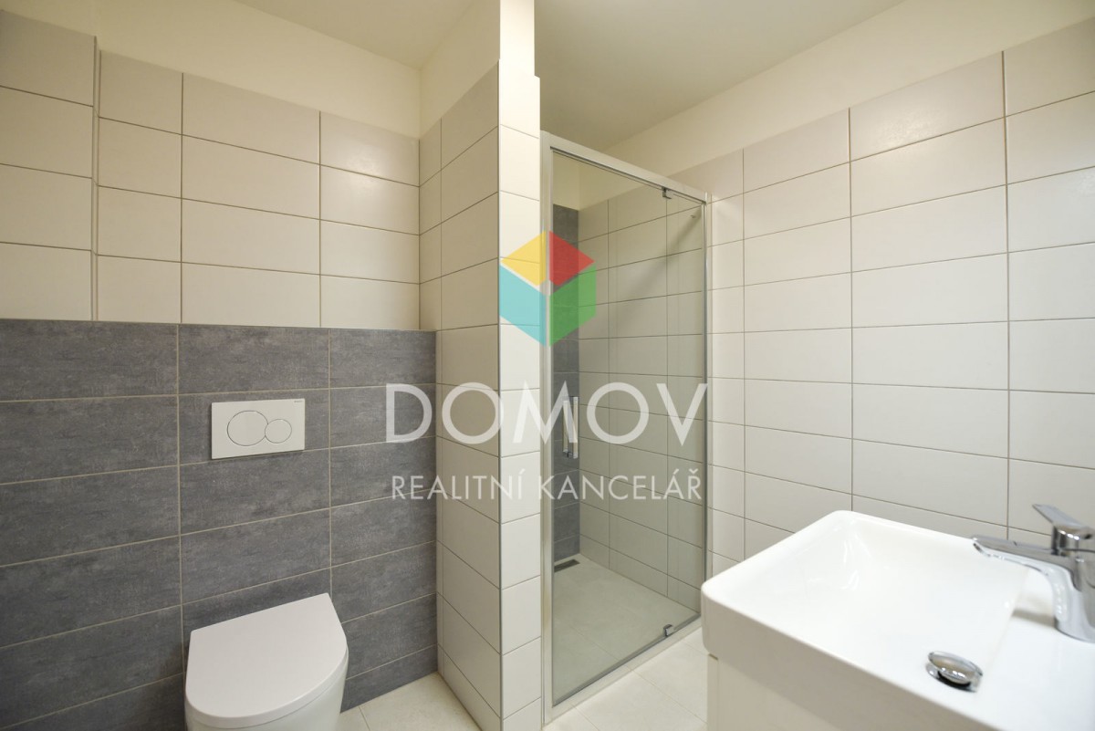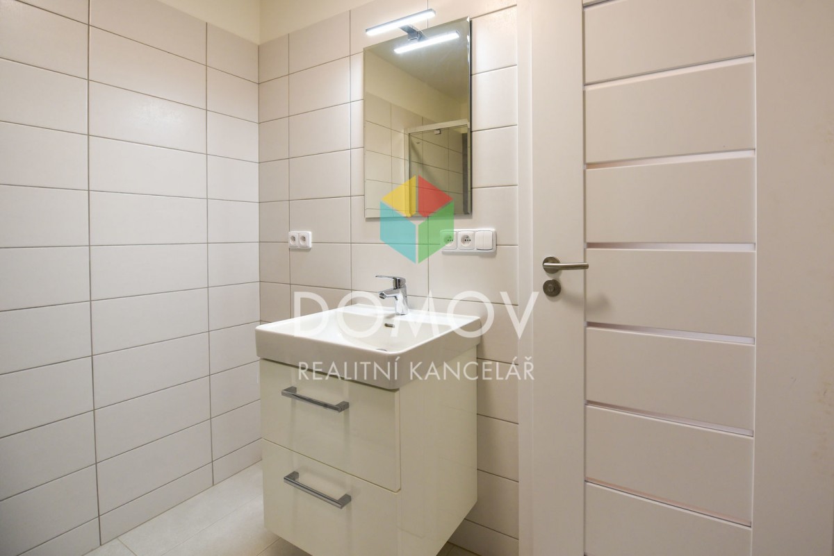 Koupelna je vybavena sprchovým koutem, umyvadlem, zrcadlem, závěsným sociální zařízení WC, otopným teplovodním žebříkem, a přípojkou pro pračku.