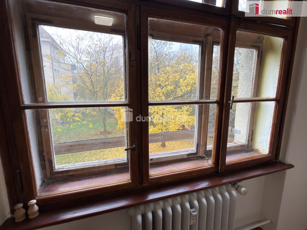 V bytě jsou dřevěné podlahy, dvojitá dřevěná okna s výhledem do vnitrobloku kde je příjemný pohled.