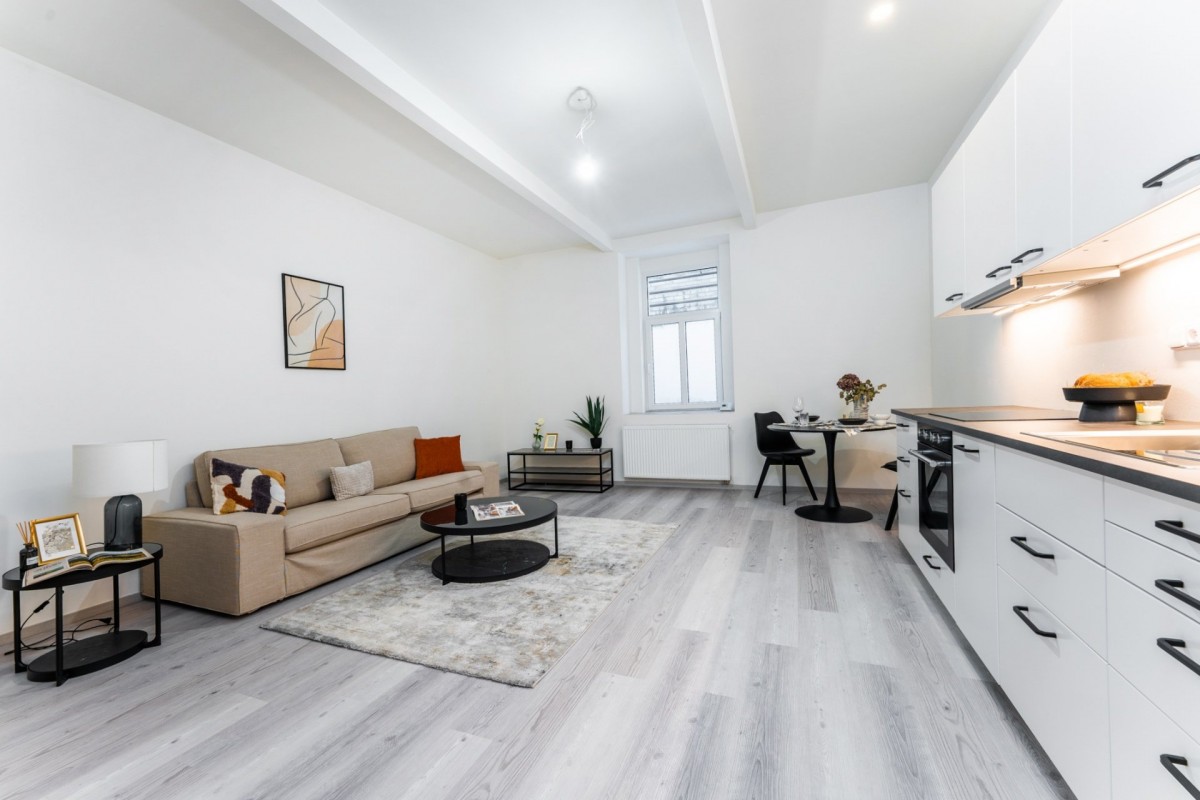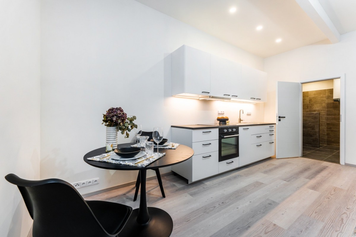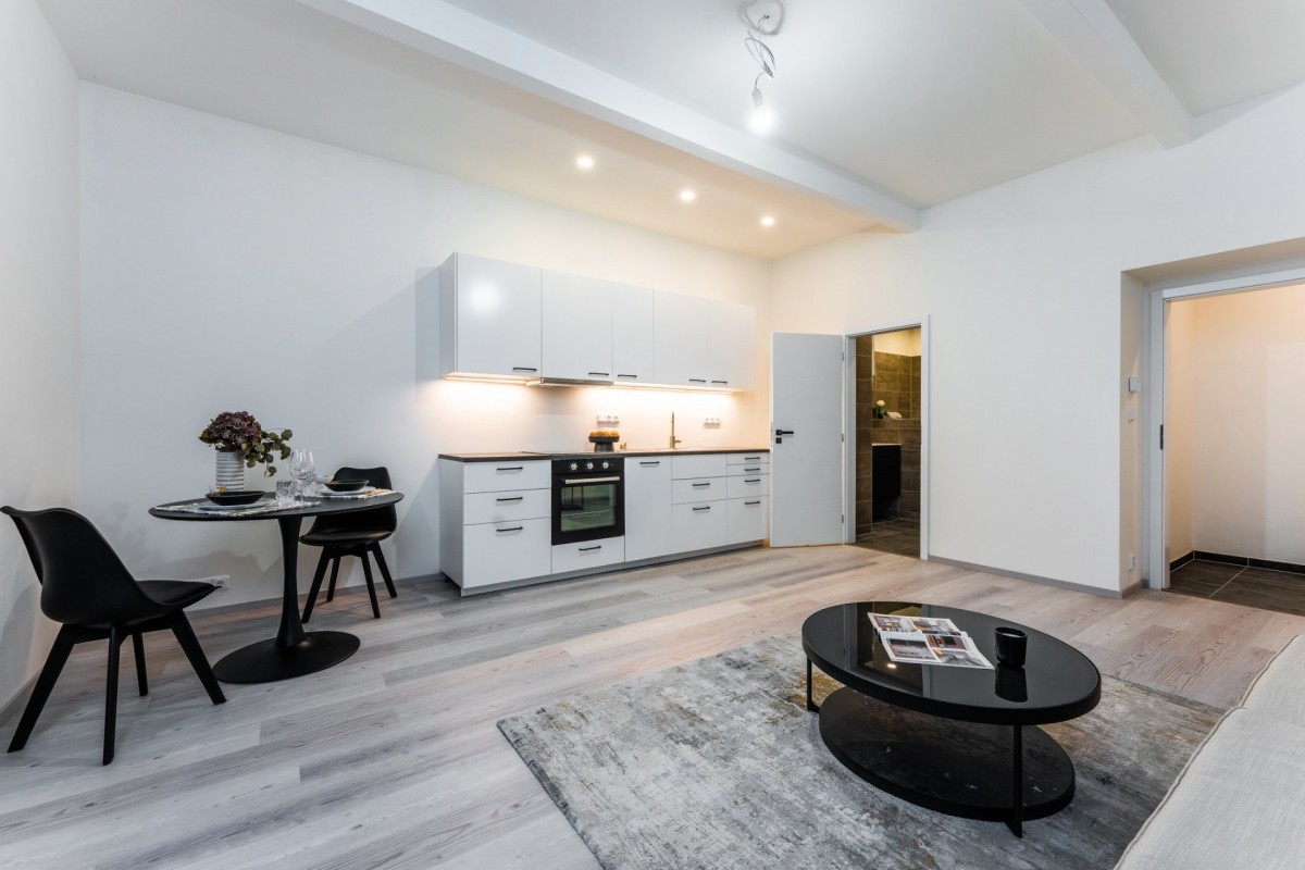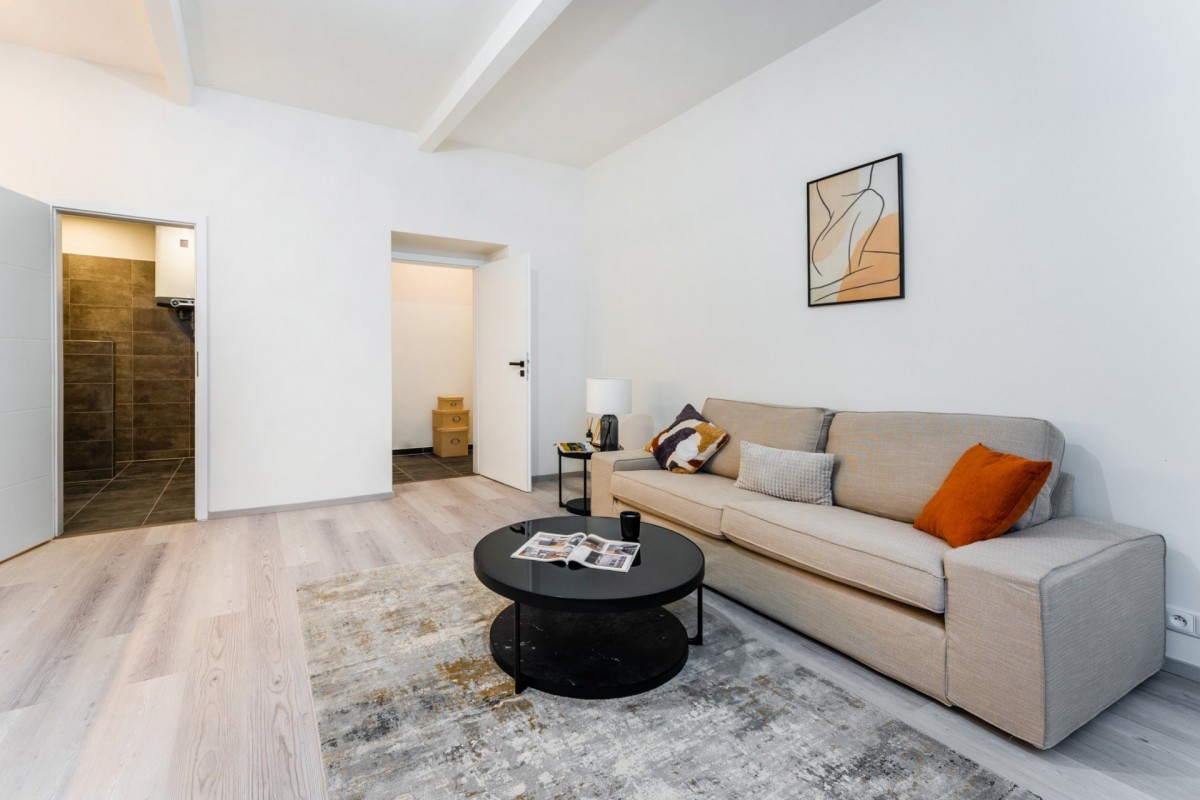 Nachází se v 1. PP a je orientován na severozápad. Ložnice je v neprůchozím pokoji. Průchozí pokoj pak slouží jako obývací pokoj s kuchyňským ko...utem. V bytě je dále koupelna a chodba. Vše po kompletní rekonstrukci. Byt se pronajímá bez vybavení. Energie se převádí na nájemníka.