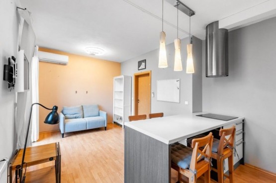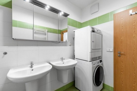 Vybavení bytu zahrnuje pračku, sušičku, lednici, mikrovlnnou troubu, troubu, indukční plochu, pohovku, postel, skříň v ložnici a skříň na chodbě