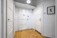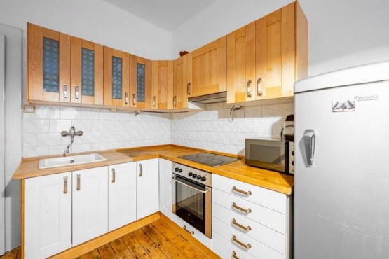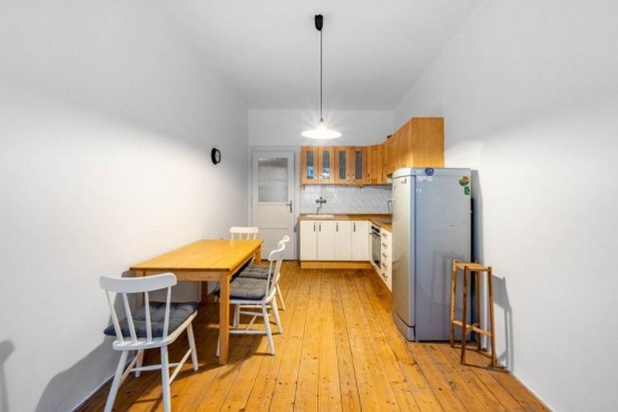 Vybavení bytu zahrnuje kompletně vybavenou kuchyňskou linku v bílém designu, nové zárubně a dveře, původní špaletová okna, nové plovoucí podlahy v dekoru dřeva, bezpečnostní dveře, plynové vytápění, pračka a myčka.