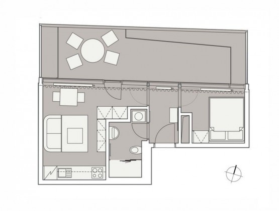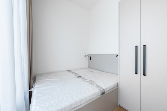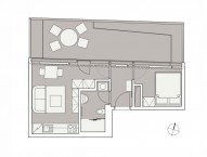 Dispozice bytu zahrnuje vstupní chodbu, obývací prostor s kuchyní, se vstupem na terasu a oddělenou spací zónou. Samostatný pokoj s pracovním stolem, koupelna se sprchovým koutem a toaletou.