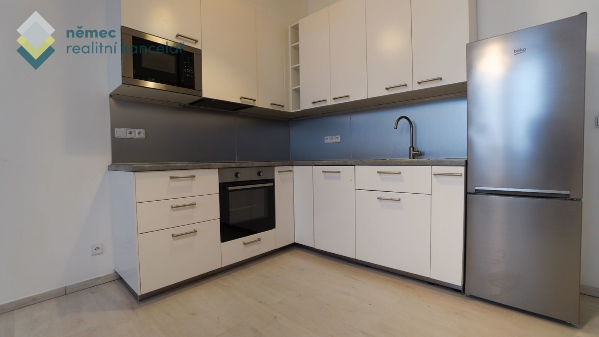 Prostorná a nadstand...ardní jednotka upravená v roce 2017 je dispozičně řešena samostatnou ložnicí s vestavnými skříněmi (14, 8 m²), obývacím pokojem (21, 3 m²) s kuchyňským koutem na míru včetně nerezových spotřebičů (kuchyně zn. IKEA s hork. troubou, indukční sklokeramickou deskou, digestoří, myčkou, a samostatná lednice s kombinovaných mrazákem), dále koupelnou se sprchovým koutem, kondenzačním plynovým kotlem Junkers, umyvadlem, el. podlahovým vytápěním, skříňkami a prostorem na pračku (4, 1 m²), velkou chodbou (9, 1 m²) s úložným prostorem pod stropem, samostatným sociální zařízení WC (1, 1 m²) a komorou (1, 1 m²).