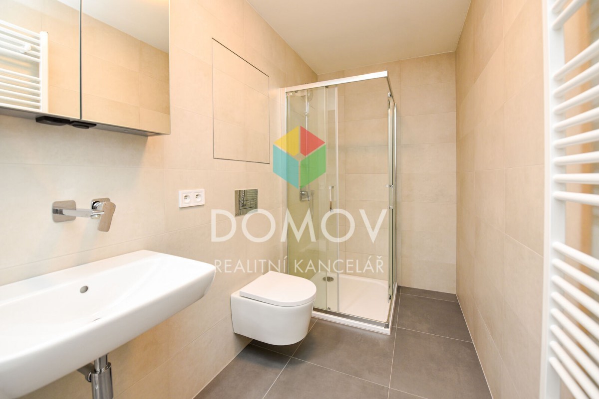 Na podlahách položena plovoucí podlaha, v koupelně velkoformátová dlažba, sprchový kout, závěsné sociální zařízení WC, umyvadlo s koupelnovou skříňkou a prostor pro pračku.