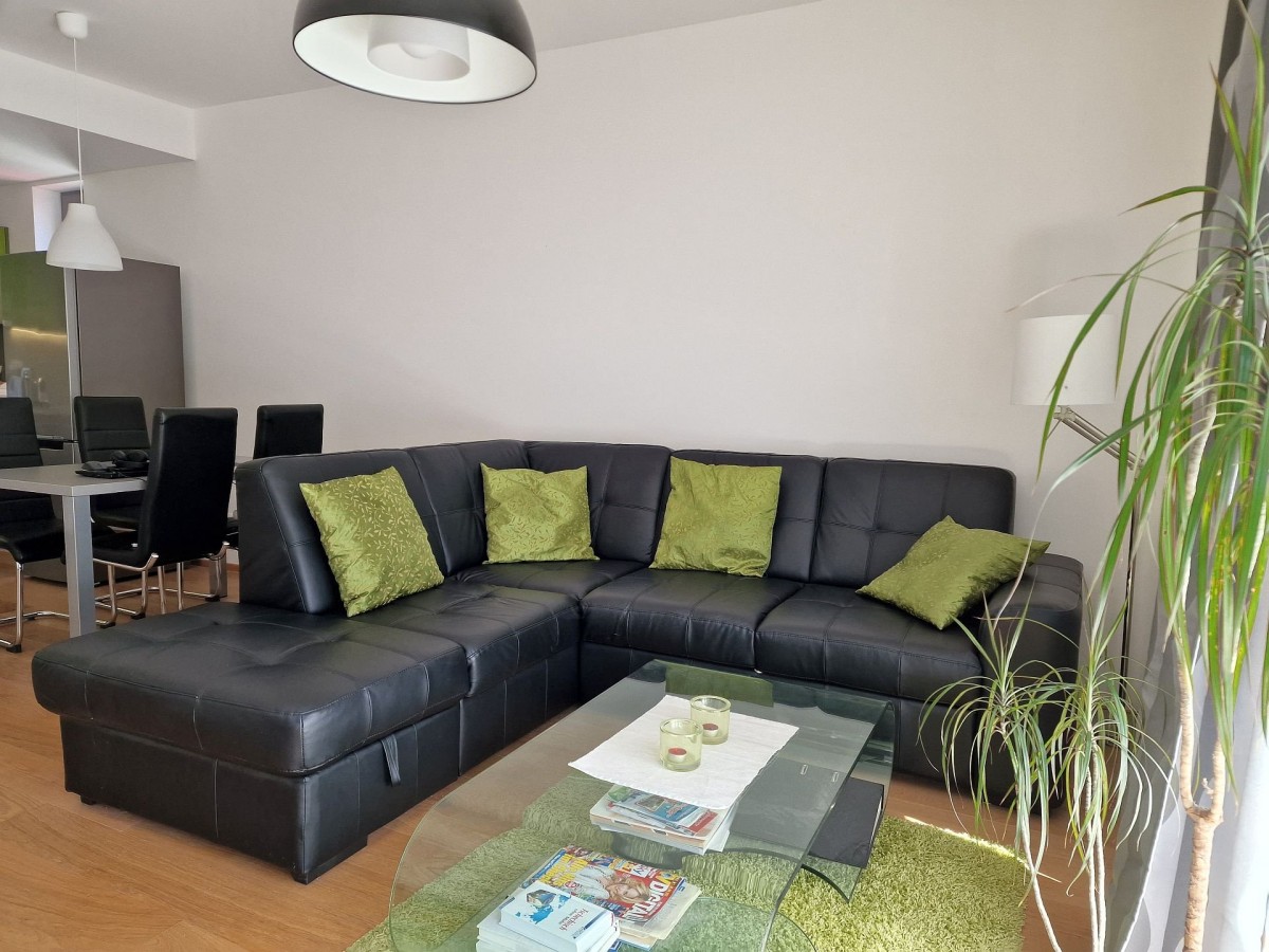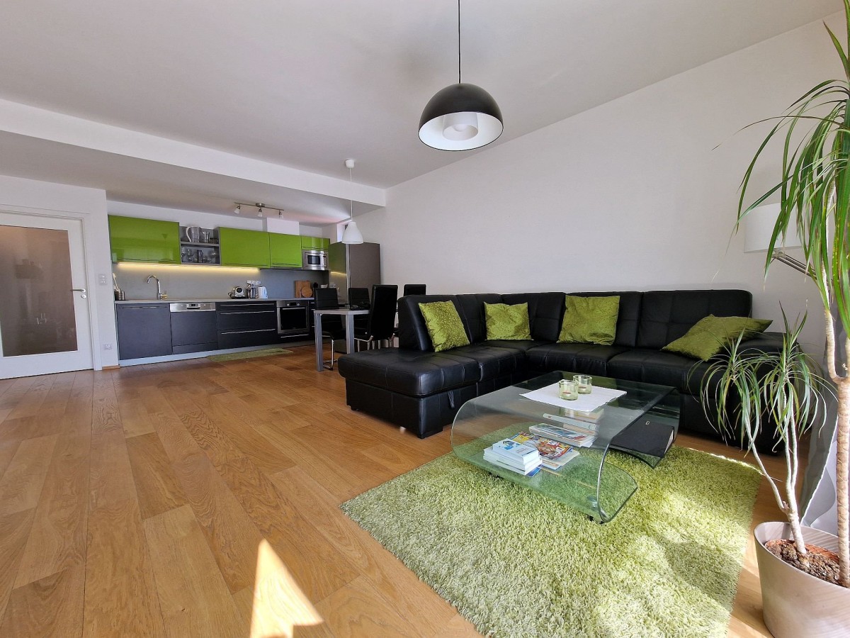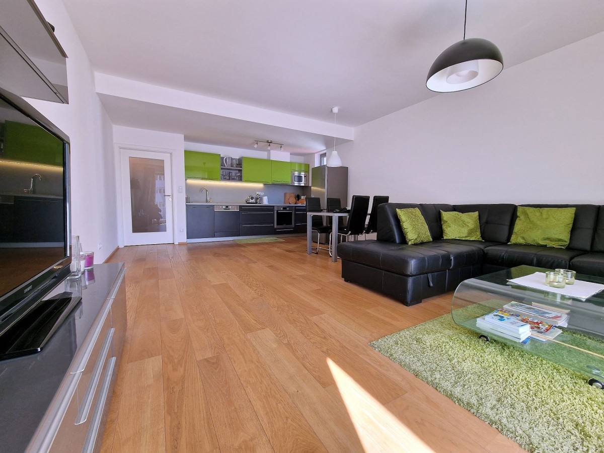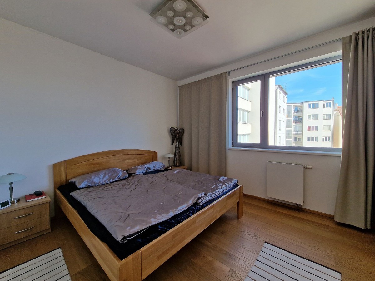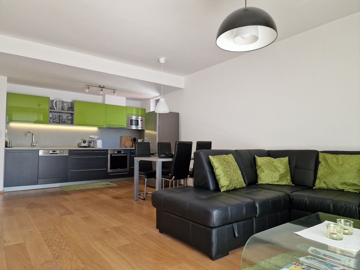 Nabízený byt je zařízen moderním nábytkem, podlahu kryje dřevěná podlaha. V obývacím pokoji je sedací souprava, konferenční stolek, televizní stolek, velkoplošná TV, jídelní stůl s židlemi pro čtyři osoby a moderní kuchyňská linka, která je vybavena vestavěnými spotřebiči. Na balkoně je venkovní nábytek k příjemnému posezení. V ložnici je manželská postel a vestavěná skříň. Ve vstupní chodbě je botník a šatník. V koupelně s vanou, sociální zařízení WC a umyvadlem je koupelnový nábytek, dále také pračka a pro pohodlí uživatelů je v koupelně podlahové vytápění. Do bytu je přiveden internetové připojení, TV, SAT a videotelefon pro komunikaci s recepcí. Dům je vybaven kamerovým systémem.