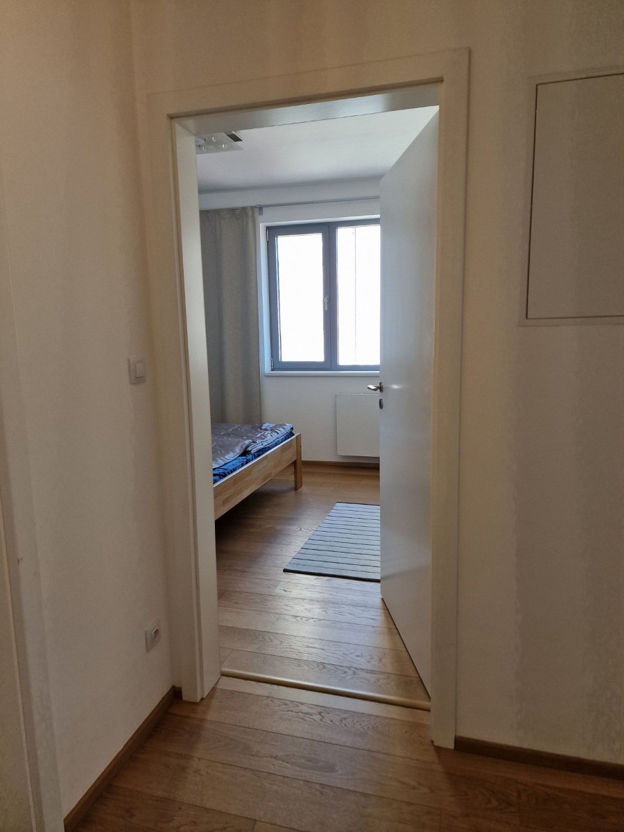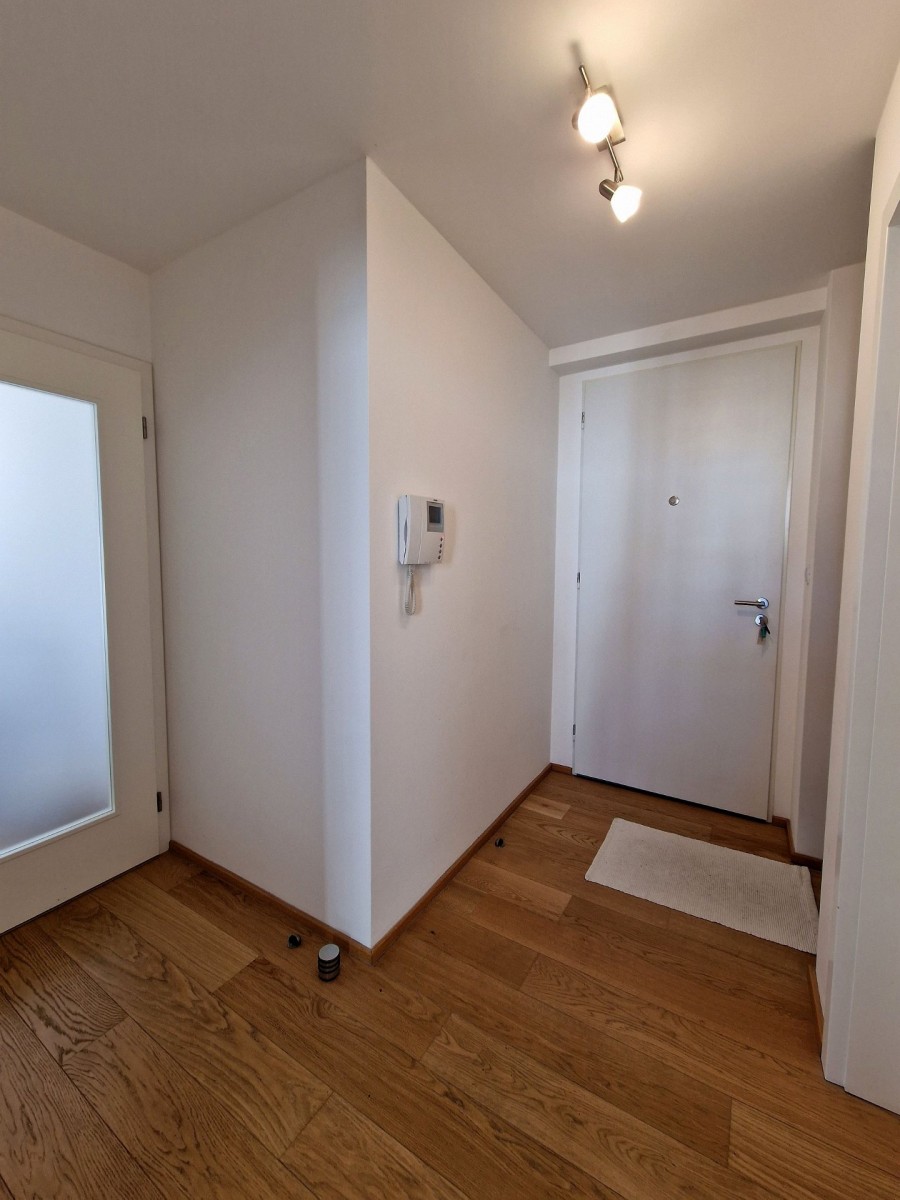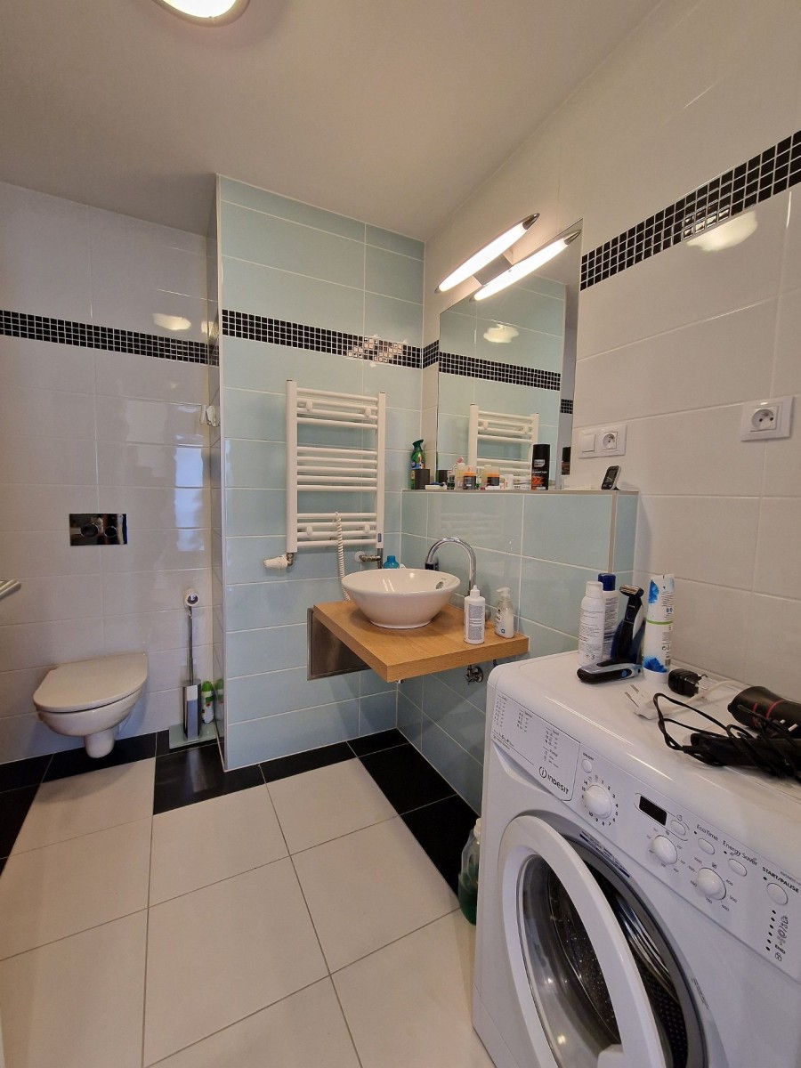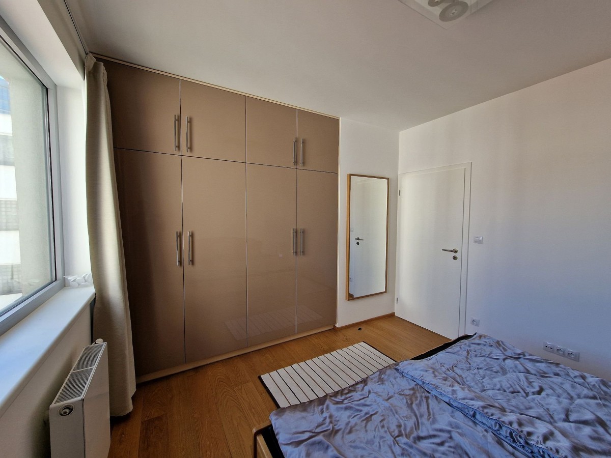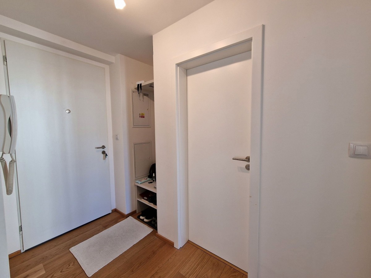 Nabízený byt je zařízen moderním nábytkem, podlahu kryje dřevěná podlaha. V obývacím pokoji je sedací souprava, konferenční stolek, televizní stolek, velkoplošná TV, jídelní stůl s židlemi pro čtyři osoby a moderní kuchyňská linka, která je vybavena vestavěnými spotřebiči. Na balkoně je venkovní nábytek k příjemnému posezení. V ložnici je manželská postel a vestavěná skříň. Ve vstupní chodbě je botník a šatník. V koupelně s vanou, sociální zařízení WC a umyvadlem je koupelnový nábytek, dále také pračka a pro pohodlí uživatelů je v koupelně podlahové vytápění. Do bytu je přiveden internetové připojení, TV, SAT a videotelefon pro komunikaci s recepcí. Dům je vybaven kamerovým systémem.