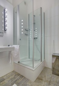 Koupelna se sprchovým koutem, sociální zařízení WC s dlažbou.