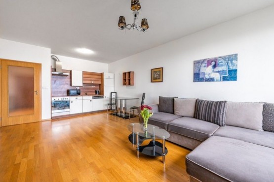 Pronájem útulného bytu 2+KK (60m2) včetně garážového stání a zděného sklepa je situovaný v 6. NP (šesté nadzemní patro) v nové inspirativní lokalitě v Praze Stodůlky v rezidenční budově projektu Prague Towers s jed...inečným výhledem na Prahu, novostavba z roku 2011.