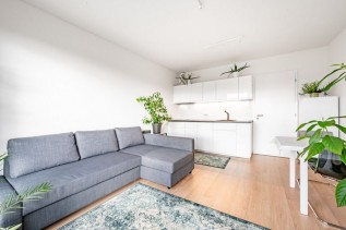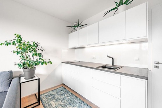 Byt je tvořen vybaveným obývacím pokojem spojeným s kuchyní, včetně myčky zn. AEG, odkud je vstup na prostornou terasu, ložnicí s kvalitní postelí s vysokou hybridní matrací, rovněž je přístup na terasu, dále koupelnou se sprchovým koutem a toaletou, včetně pračky zn. AEG, vstupní chodbou a prostornou šatnou. Byt bude pronajímán vybavený.