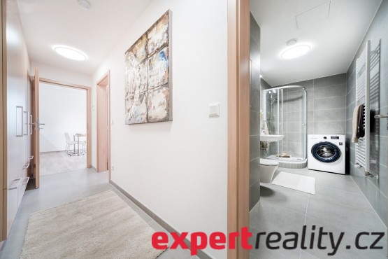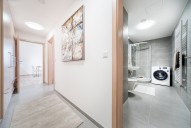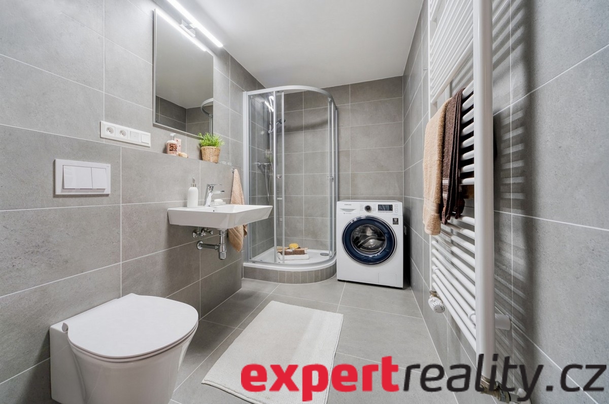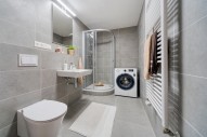 V moderní, prostorově dobře řešené koupelně sprchový kout, místo pro autom. pračku.