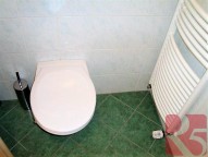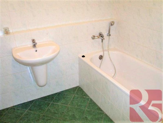 Koupelna s vanou, toaletou a připojením na pračku. Na podlaze dlažba, plovoucí podlaha a v ložnici koberec.