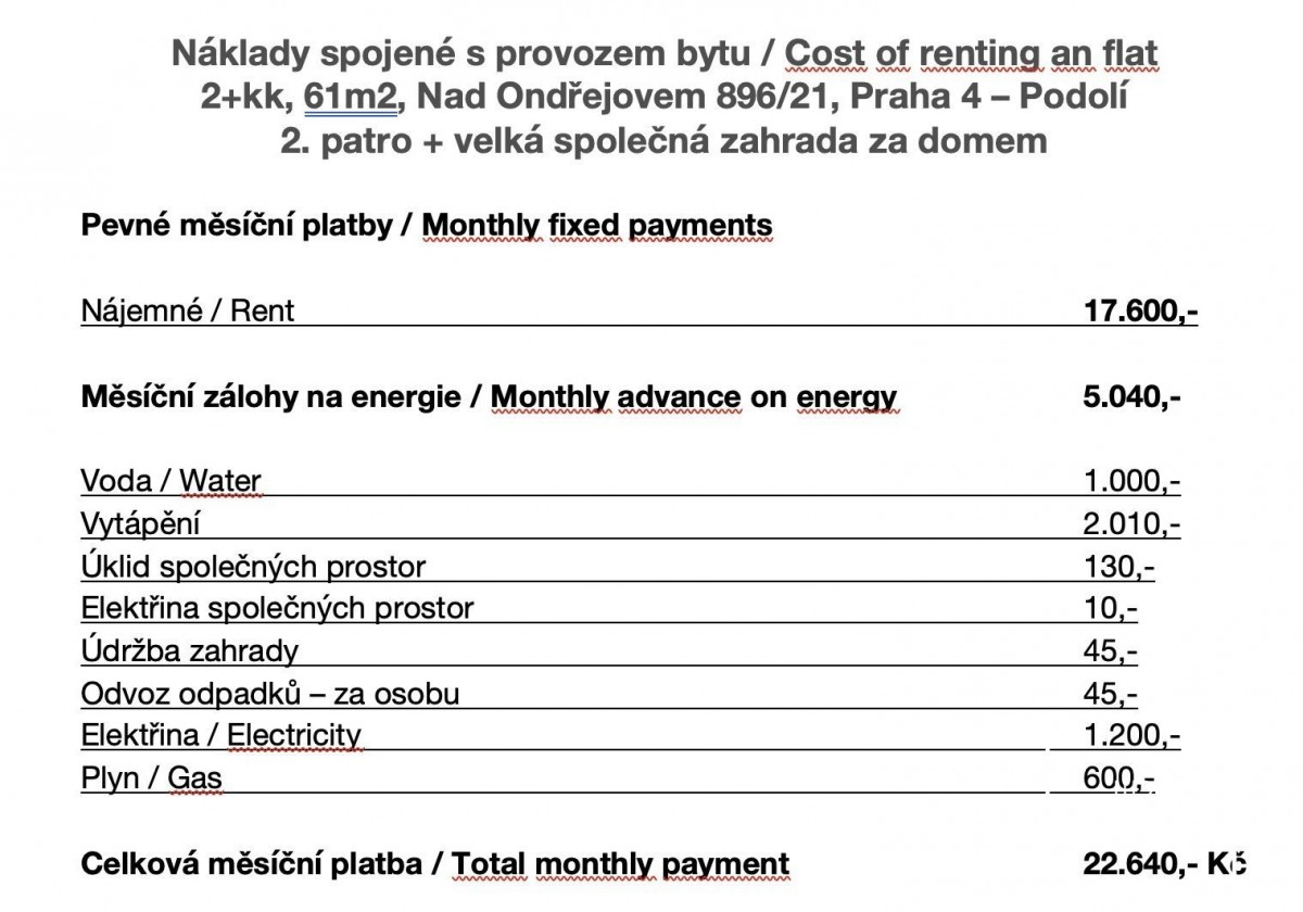 Měsíční nájemné je 17. 600, - + zálohy na služby a energie včetně elektřiny, plynu, vytápění 5. 040, - Kč.