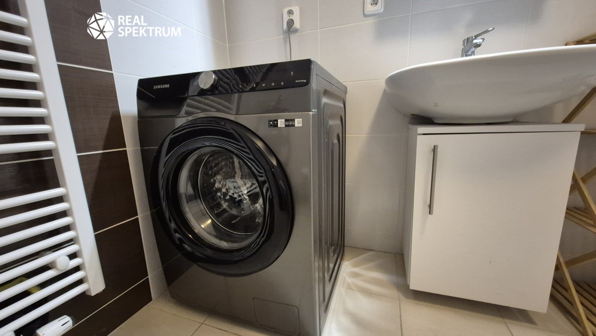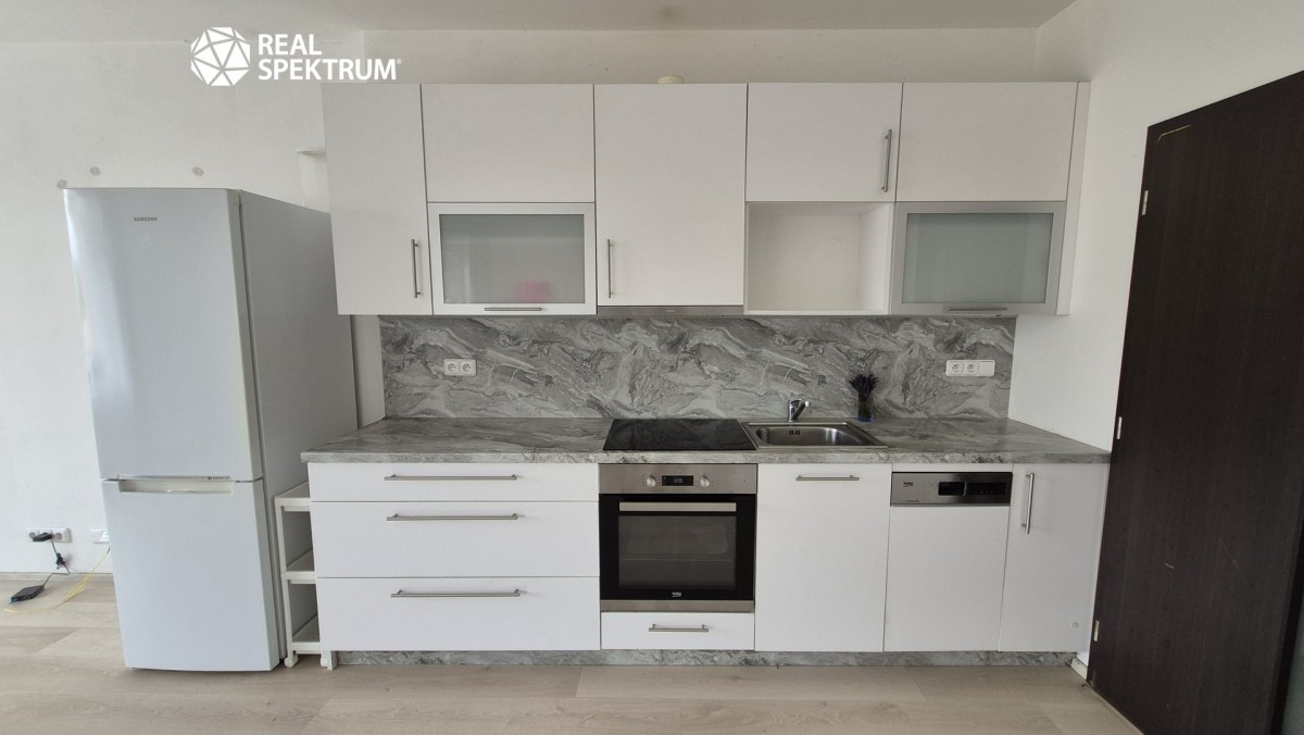 Byt se nabízí částečně vybavený, kde se nachází prostorná místnost s kuchyňskou linkou a spotřebiči (varná deska, trouba, digestoř, myčka, lednička s mrazničkou) a vstup na balkon. Druhá místnost se nabízí nevybavená a skříň se nachází ve vstupní chodbě. Koupelna je vybavena vanou, umyvadlem, toaletou a pračkou.