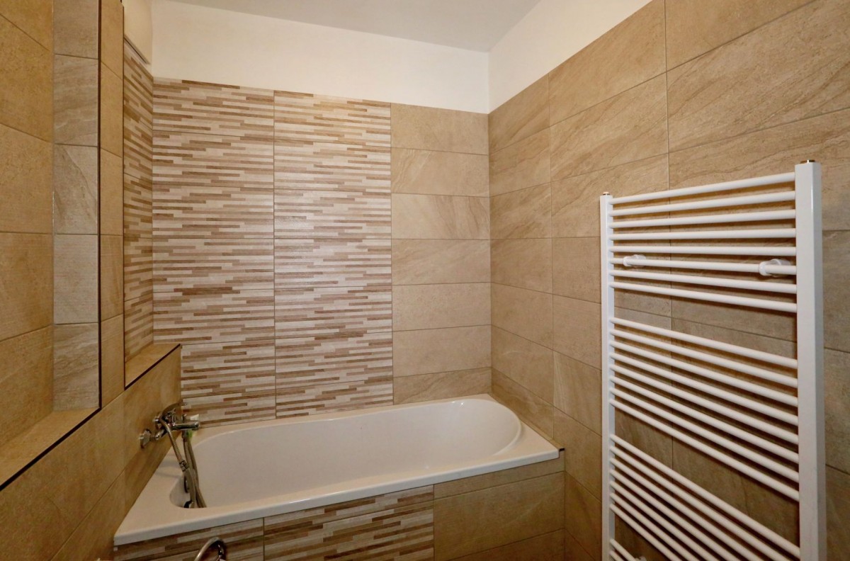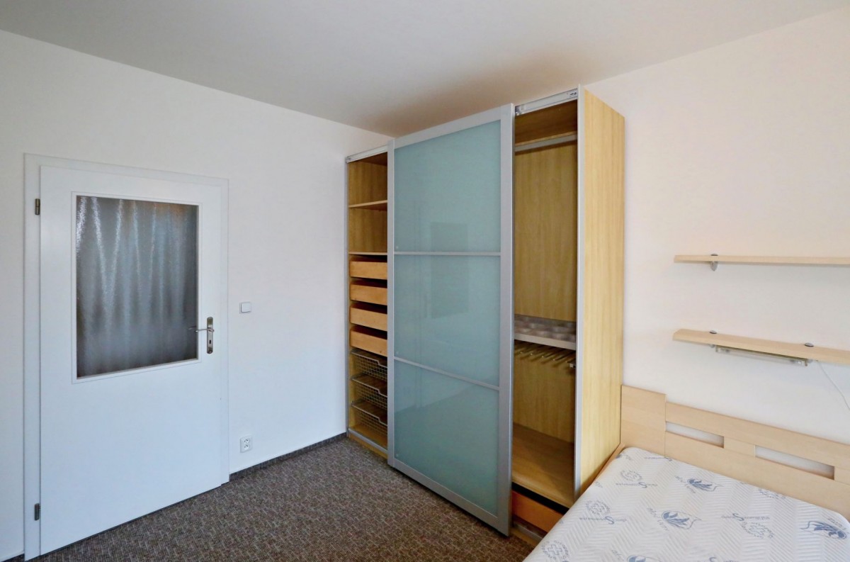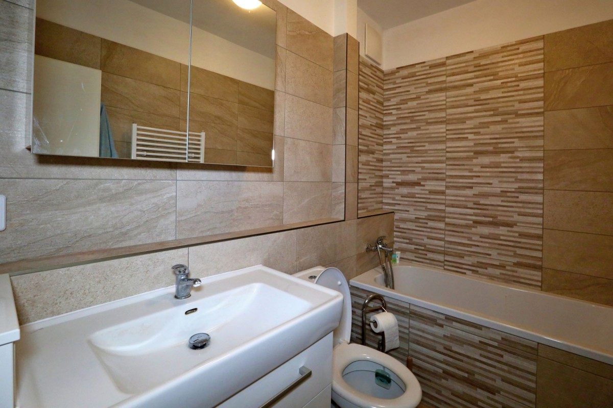 Byt je kompletně vybavený nábytkem, v koupelně vana, toaleta.