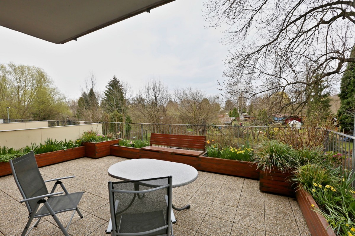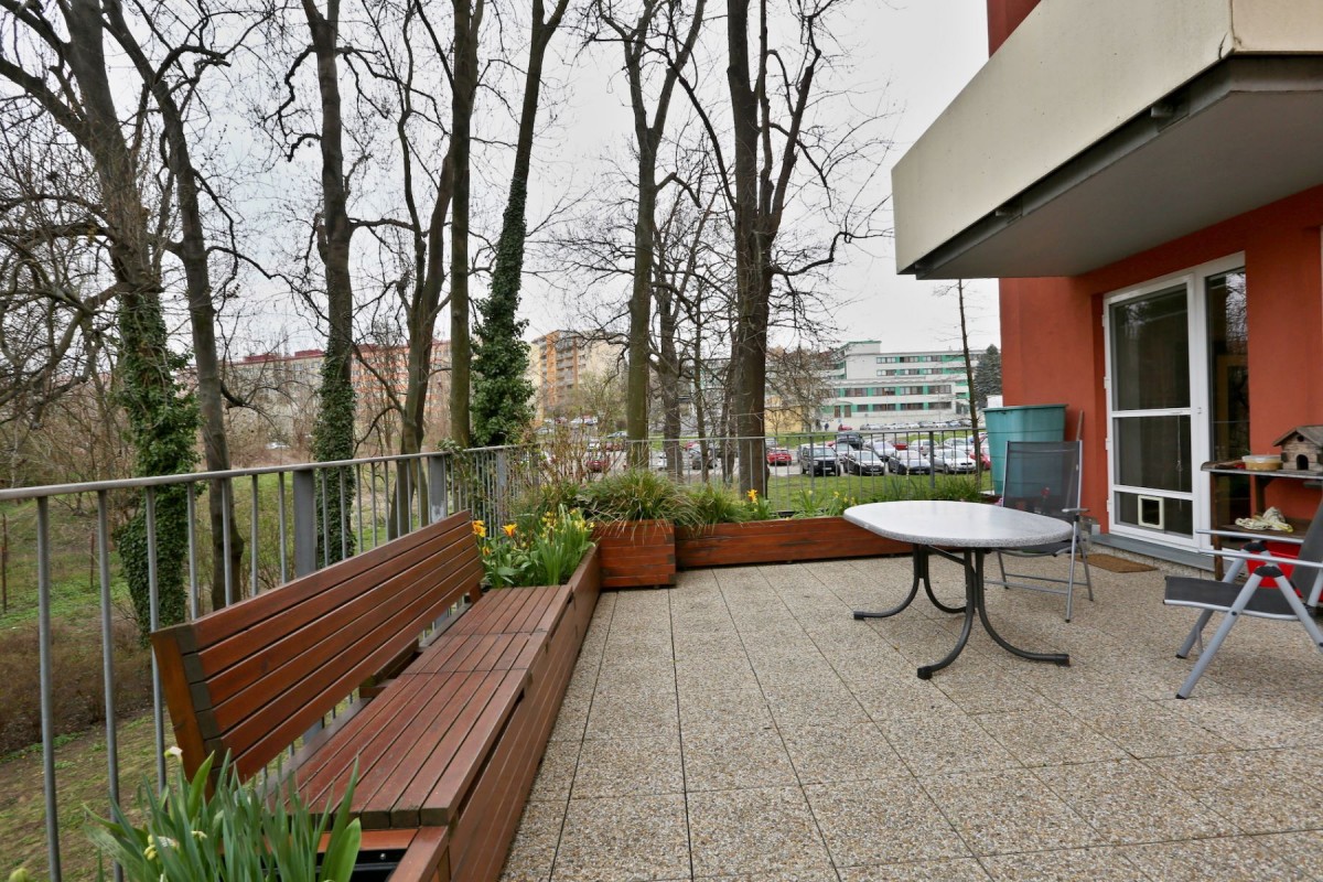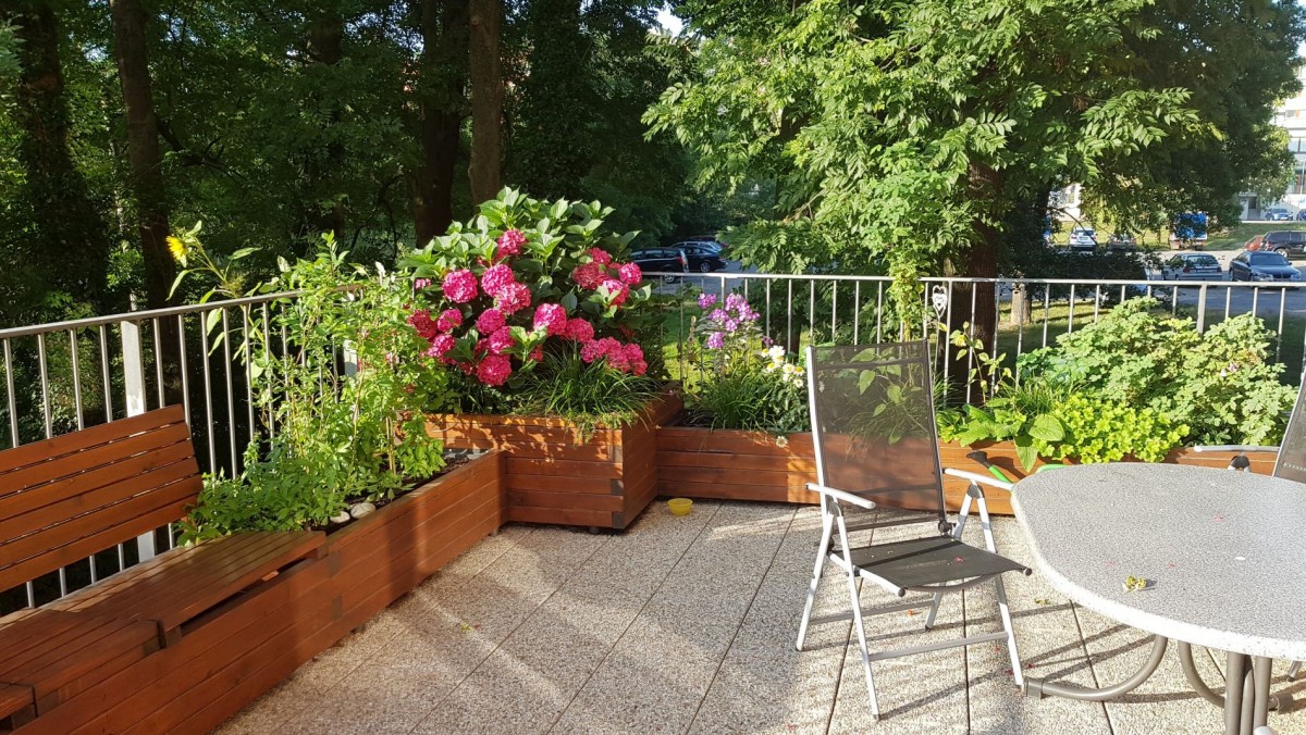 Na terase je 15 m dlouhý truhlík plně osazený keři a květinami, součástí terasy je lavička s úložným prostorem.
