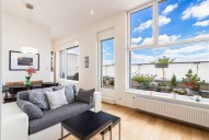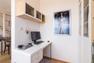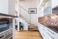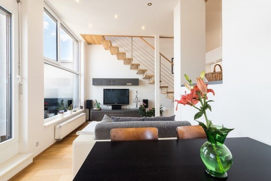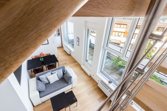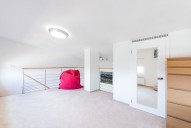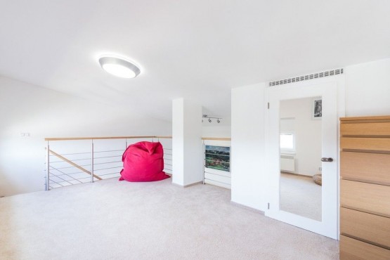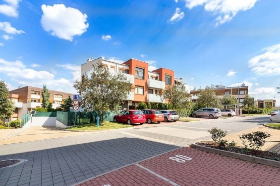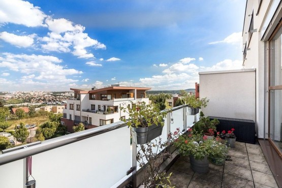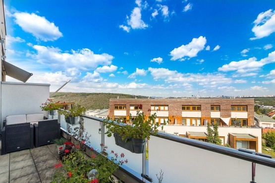 Mezonetový byt ve třetím patře novostavby včetně výtahu zaujme díky francouzským oknům svojí světlostí a moc hezkým výhledem z prostorné terasy na Prahu. Dispozičně je byt řešen jako 2+kk. Francouzská okna po celé délce obývacího pokoje, vysoký strop a propojení do ložnice točitým schodištěm umocňují pocit, že jste v mnohem větším bytě. Součástí pronájmu je parkovací stání. K dispozici kočárkárna, která je využívána spíše pro uložení kol.