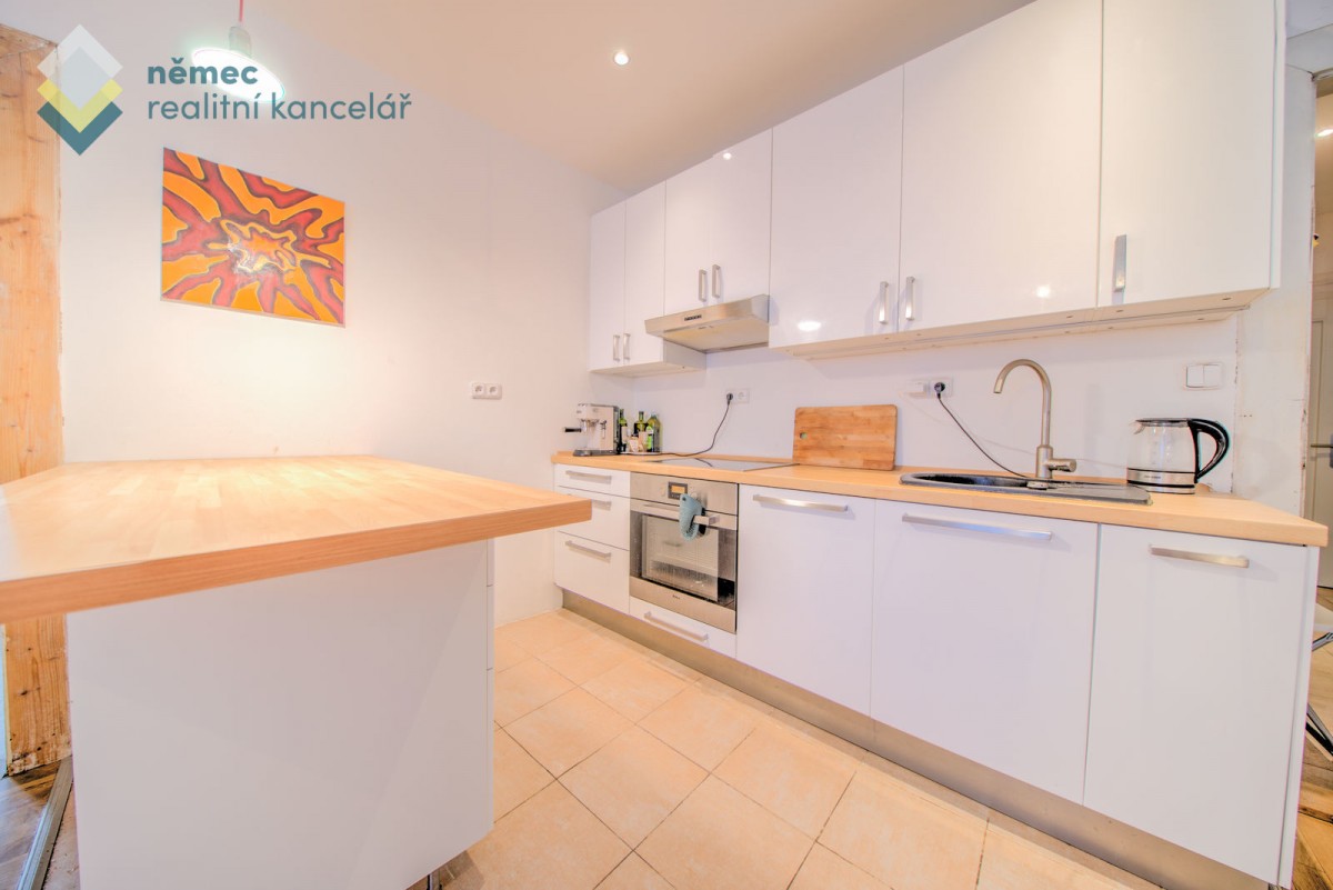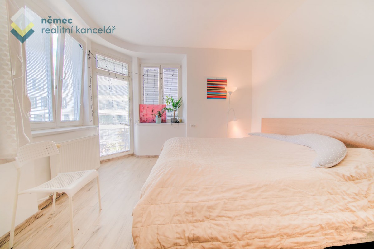 Do tohohle bytu můžete doslova přijet s kufrem a prakticky okamžitě se nastěhovat. Byt je totiž kompletně zařízen a vybaven nábytkem - kuchyň na míru včetně spotřebičů a baru, sedací souprava, TV stolek, dvojlůžko s matracemi a roštem, psací stůl se židlí, šatní systém, pračka.