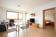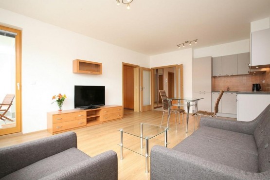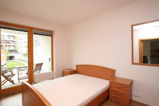 Moderní kuchyňská linka se spotřebiči lednice, trouba, varná deska, myčka, digestoř, kompletně vybavený pokoj, ložnice s vestavěnými skříněmi, koupelna s vanou a sociální zařízení WC, druhé sociální zařízení WC oddělené.