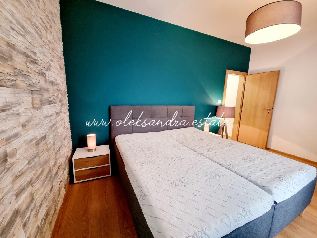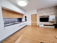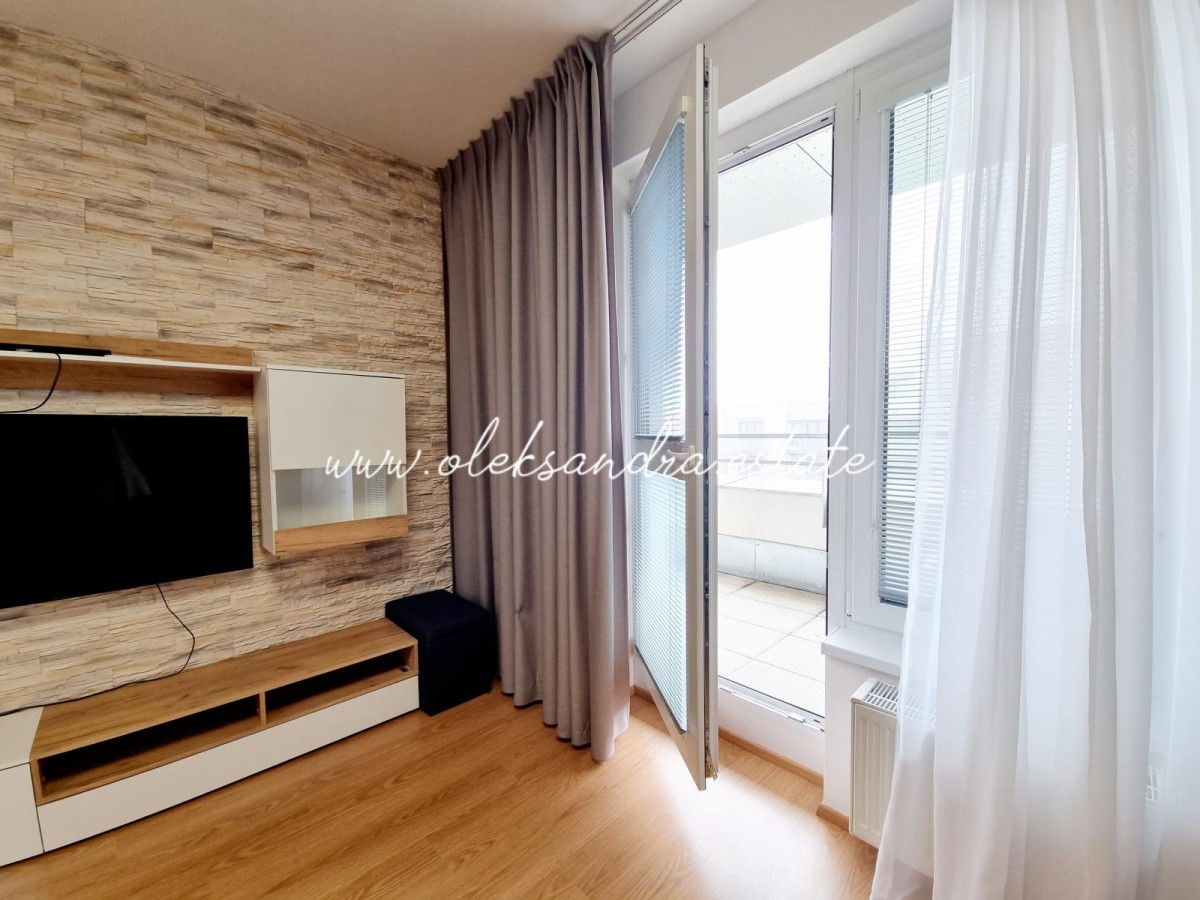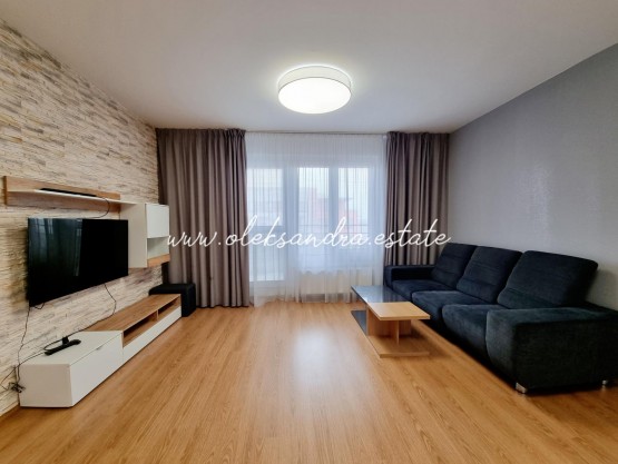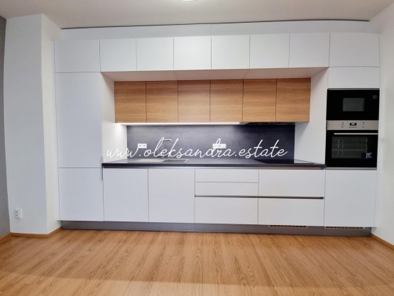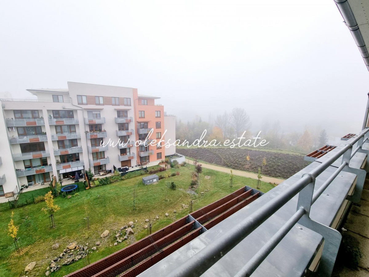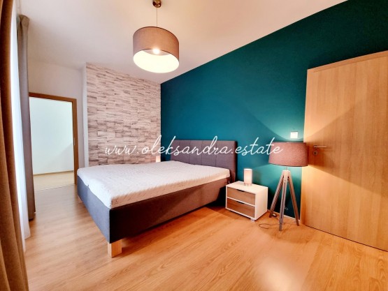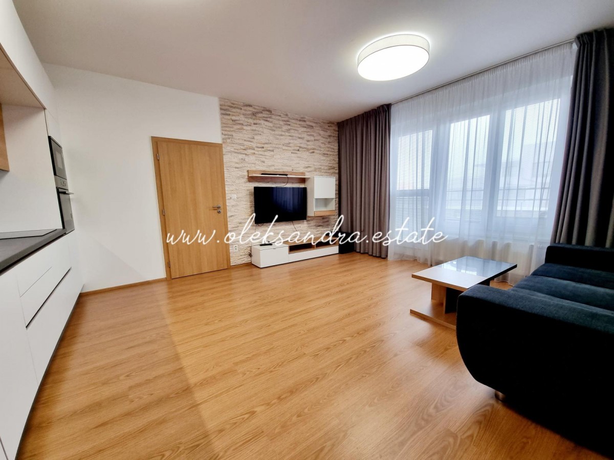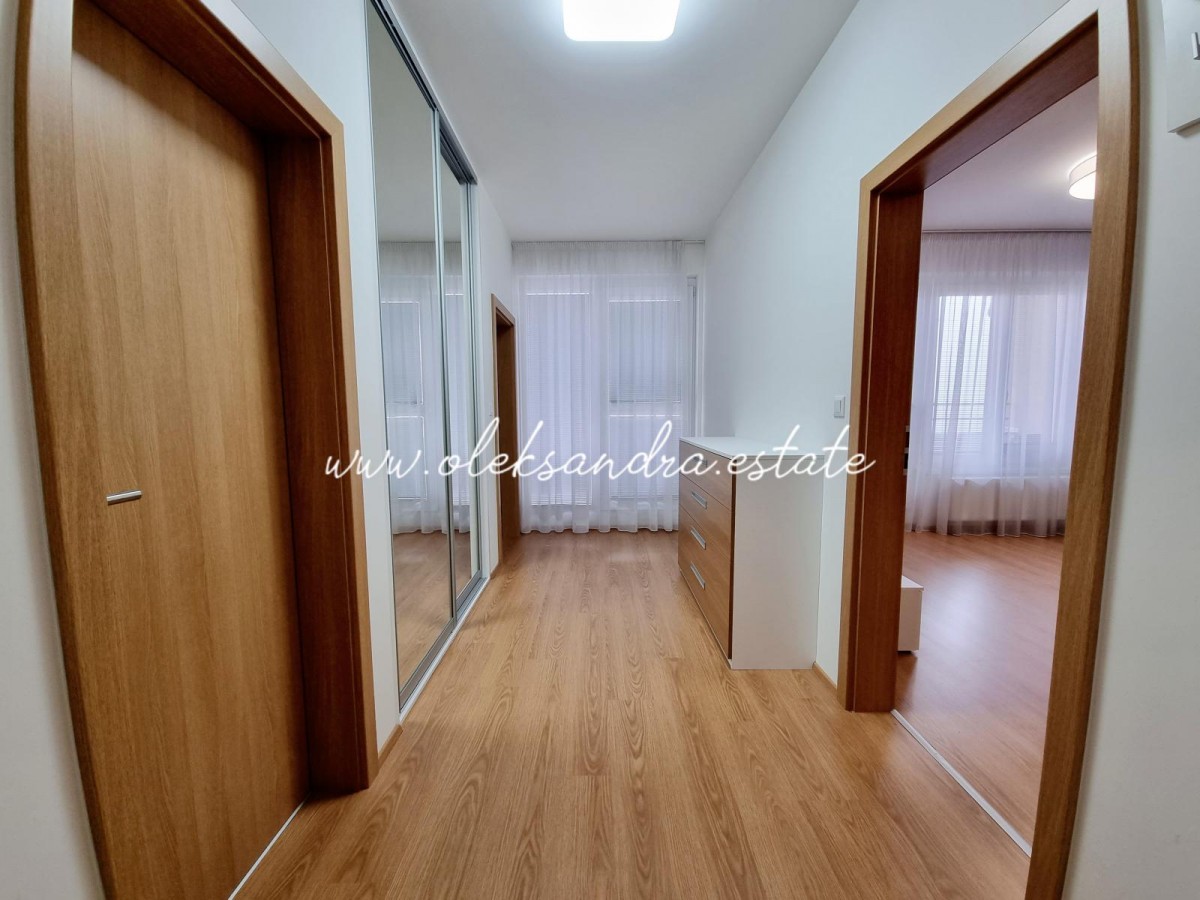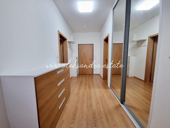 Byt tvoří obývací pokoj s plně vybavenou kuchyní, velký balkon s vcodem z každé mistností, ložnice s šatnou, koupelna s vanou a sociální zařízení WC a vstupní chodba s vestavěnou skříní.
