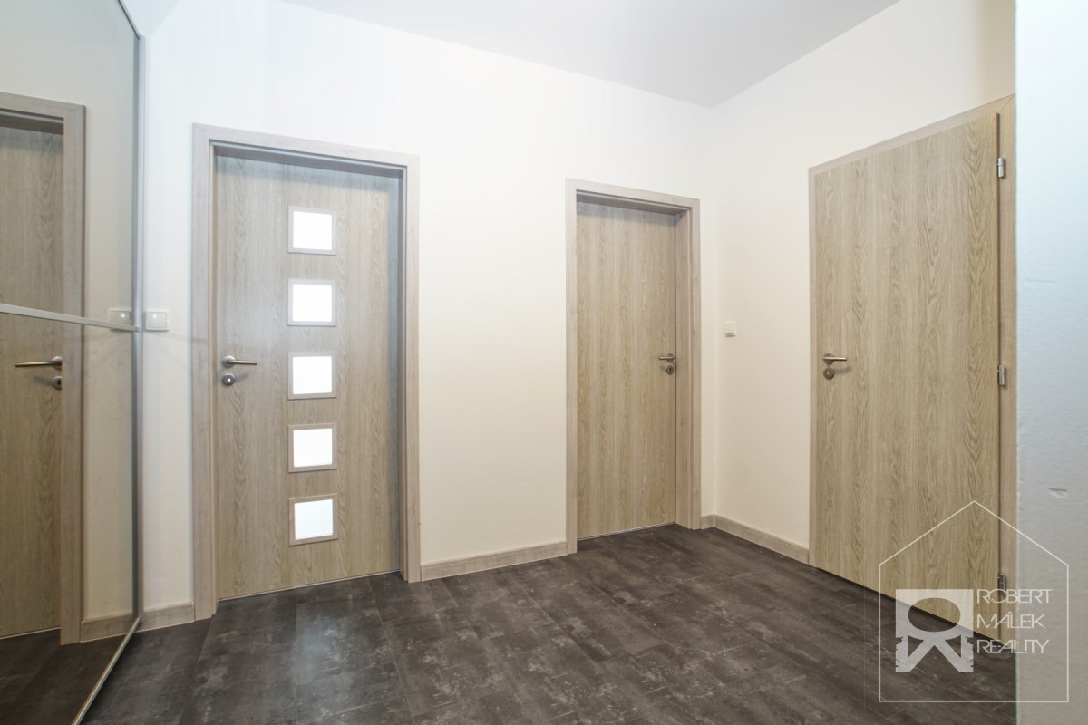 Prostorná novostavba o celkové ploše 73.... 54m2 (byt 62. 95m² + balkon 7. 59m² + sklep 3m²) s neprůchozími pokoji se nachází v 1. NP (první nadzemní patro) cihlového domu z roku 2010. Neprůchozí pokoje a předsíň s vinylovými podlahami. Koupelna a toaleta s dlažbou. Kuchyňská linka se sklokeramickou deskou a elektrickou troubou, myčkou, lednicí a digestoří. Balkon orientován na západ s výhledem na uzavřené dětské hřiště.