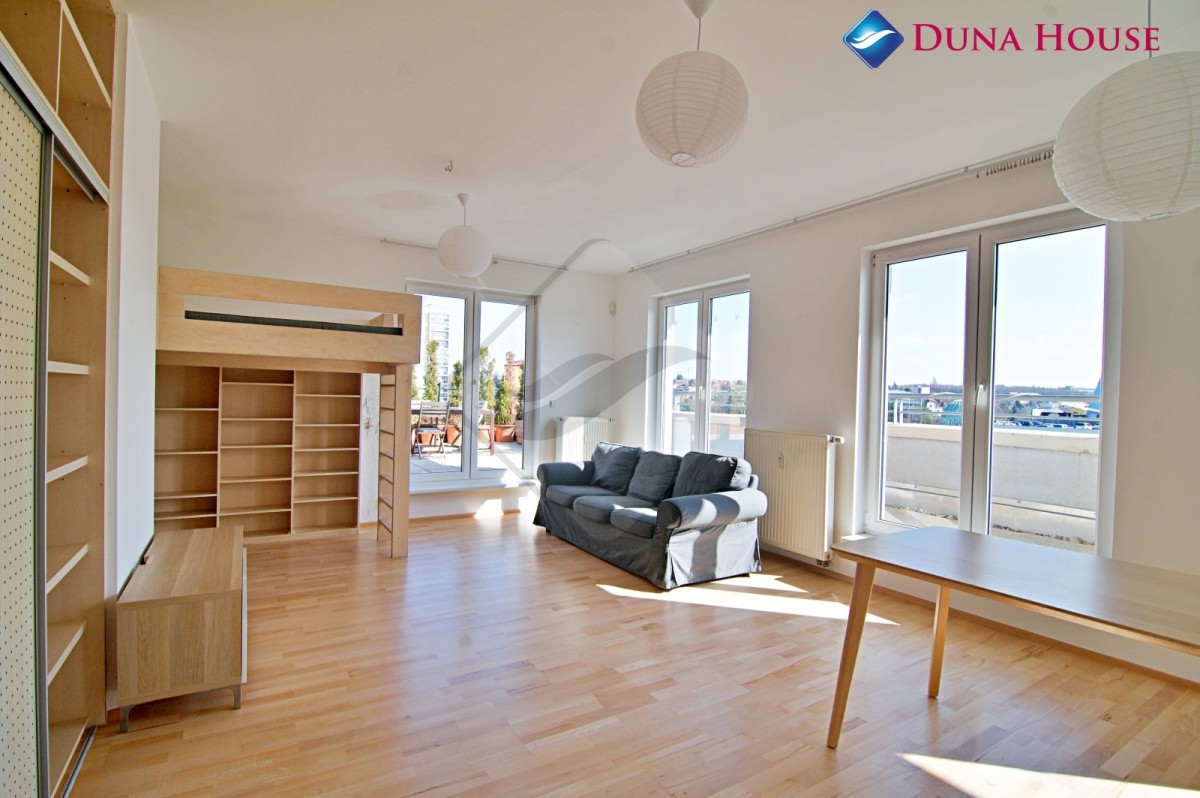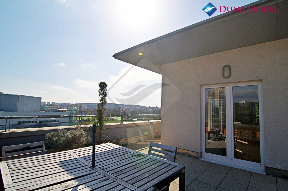 K pronájmu nabízíme prostorný byt s velkorysou terasou o výměře 100 m² v šestém patře bytového domu na Praze 10 s vlastním garážovým stáním.