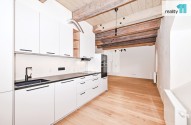 V interiéru zůstaly přiznány některé původní stavební prvky, jako dřevěné trámové stropy a okna. Okna bytu jsou orientována do vnitrobloku. Na obývací prostor navazuje kuchyň se zbrusu novou kuchyňskou linkou se zabudovanými spotřebiči (chladničkou, mrazákem, myčkou, mikrovlnnou troubou, pečící troubou, varnou deskou, digestoří). Kuchyňský prostor propojuje obývací pokoj a ložnici. V koupelně se nachází sprchový kout, umyvadlo se skříňkou, zrcadlo, topný žebřík a sociální zařízení WC. Uvnitř bytu je další komora o velikosti 3, 6 m², kde lze připojit pračku, sušičku a skladovat drobné předměty. Na podlaze v koupelně a v komoře je dlažba. V obytných místnostech je dřevěná podlaha. Distribuci tepla zajišťují radiátory s termostatickými ventily. Byt se pronajímá nezařízený. Na obrázku půdorysu v inzerci je použita vizualizace.