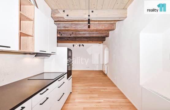 V interiéru zůstaly přiznány některé původní stavební prvky, jako dřevěné trámové stropy a okna. Okna bytu jsou orientována do vnitrobloku. Na obývací prostor navazuje kuchyň s kuchyňskou linkou se zabudovanými spotřebiči (chladničkou, mrazákem, myčkou, mikrovlnnou troubou, pečící troubou, varnou deskou, digestoří). Kuchyňský prostor propojuje obývací pokoj a ložnici. V koupelně se nachází sprchový kout, umyvadlo se skříňkou, zrcadlo, topný žebřík a sociální zařízení WC. Uvnitř bytu je další komora o velikosti 3, 6 m², kde lze připojit pračku, sušičku a skladovat drobné předměty. Na podlaze v koupelně a v komoře je dlažba. V obytných místnostech je dřevěná podlaha. Distribuci tepla zajišťují radiátory s termostatickými ventily. Součástí bytu je pračka a šatní skříň v ložnici (není na fotografiích). Na obrázku půdorysu v inzerci je použita vizualizace.