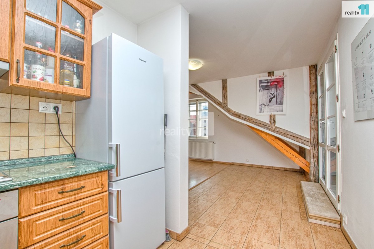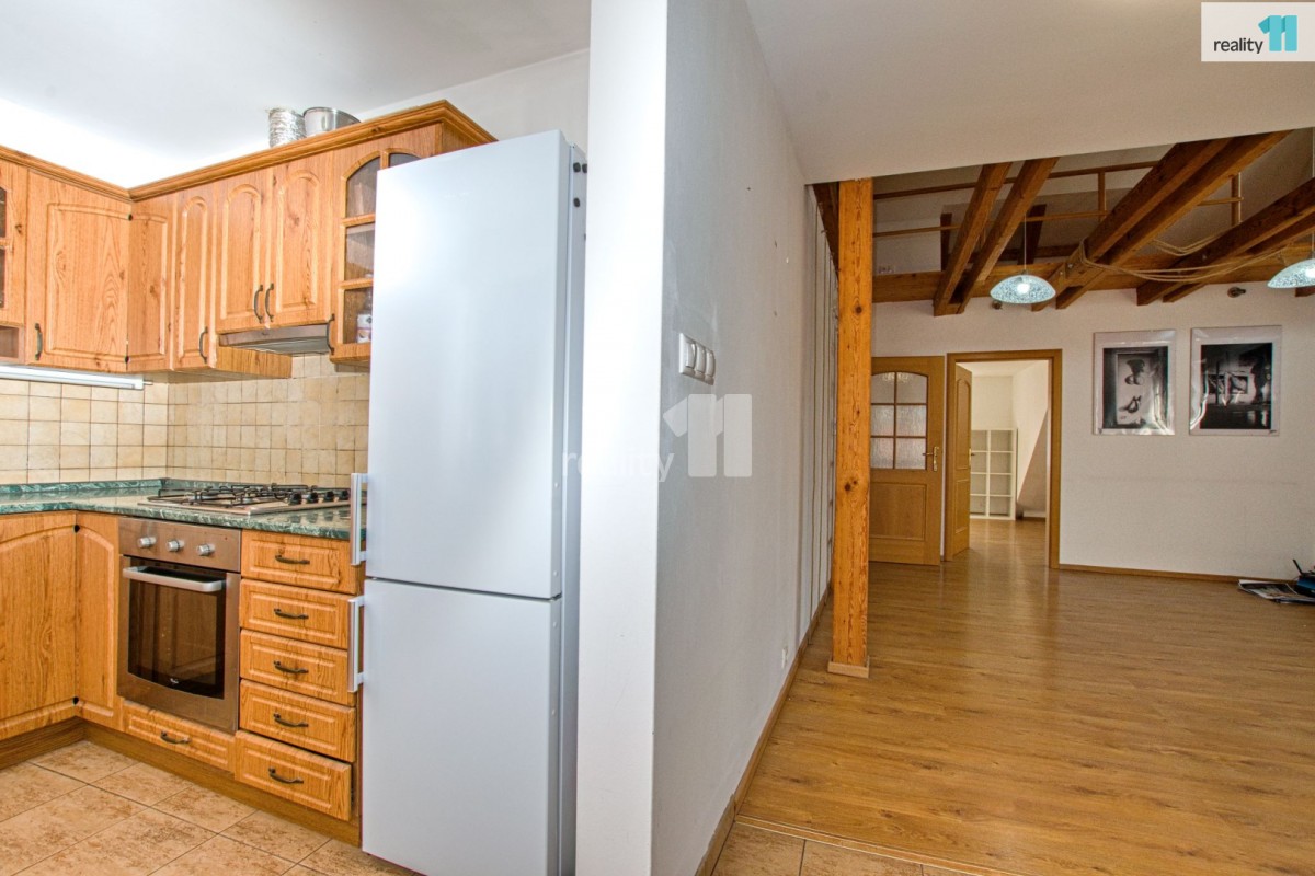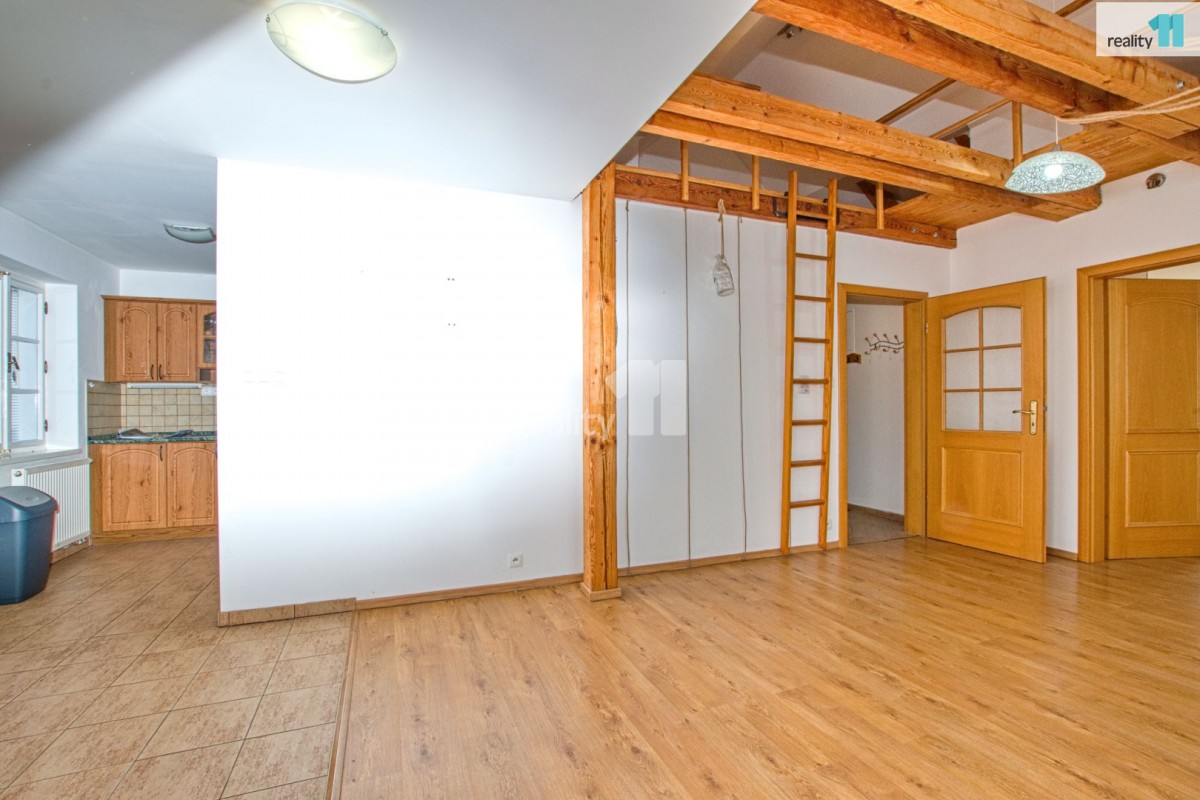 prostor po rozsáhlé rekonstrukci před cca 15 lety. V samotném bytě v posledním patře bez výtahu kuchyňská linka, podlahy laminátové, koupelna s