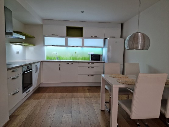 Nabízený byt má prostorný obývací pokoj s kuchyňským koutem, ve kterém dominují velká prosklená okna s jedinečným výhledem do zeleně parku. Do ložnice se vstupuje samostatným vchodem z předsíně. Moderní nábytek, skříně, osvětlení, vše působí velice útulně. Kuchyňská linka má vestavěné spotřebiče jako je elektrická trouba, myčka, sklokeramická indukční varná deska, digestoř lednice s mrazákem nebo mikrovlnná trouba atd. V jídelní části je stůl se židlemi, v obývací části pak velká sedací souprava s konferenčním stolkem, obývací stěna s velkoplošnou televizí. V ložnici s manželskou postelí je další šatní skříň. V prostorné koupelně s vanou, umyvadlem a toaletou je umístěna pračka. V předsíni je velká vestavěná skříň, šatník a botník, v bytě je dostatek úložného prostoru i díky komoře umístěné přímo v bytě 2, 2 m2. Komora umístěná u vstupu do bytu lze využít jako šatna.