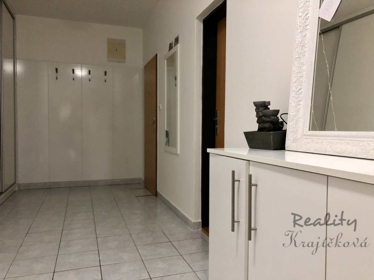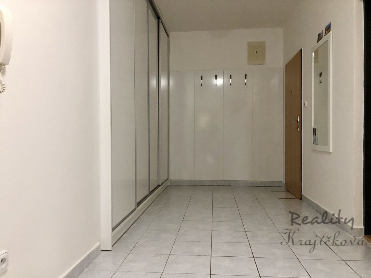 Dispozice bytu je následující: prostorná chodba s vestavěnými skříněmi, po levé straně je vstup do koupelny s vanou, umyvadlem, sociální zařízení WC.