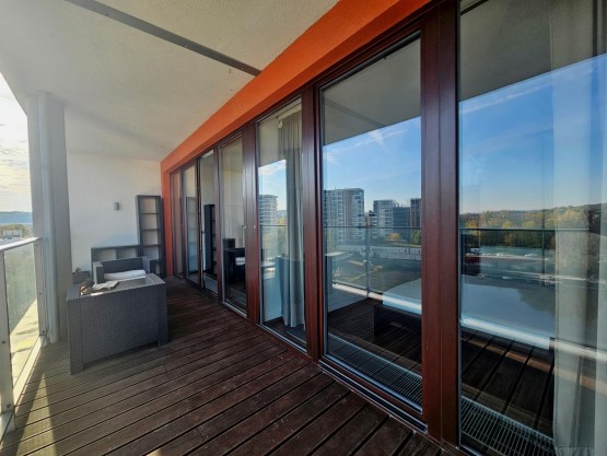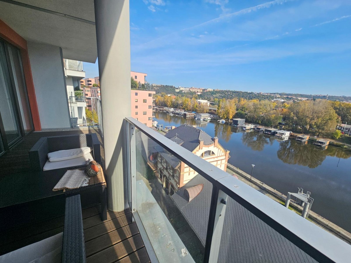 Velkorysý balkón přístupný z obou místností s úchvatným výhledem na Vltavu.