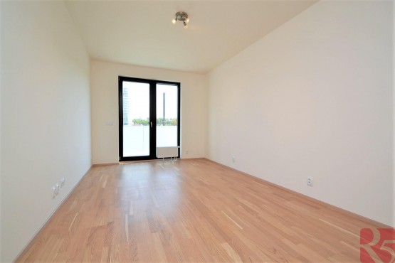 Obývací pokoj je spojen společně s kuchyňskou linkou, která je kompletně vybavená (tj. včetně myčky, trouby, varné desky, digestoře, lednice s mrazákem). Linka je do tvaru U. V obývacím pokoji i ložnici vstup na prostorný balkón, který nabízí výhled do okolí. Dřevěné okna lze zastínit žaluziemi. Obě místnosti mají dřevěné podlahy.