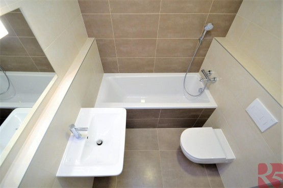 Koupelna je vybavena umyvadlem se zrcadlem a vanou.