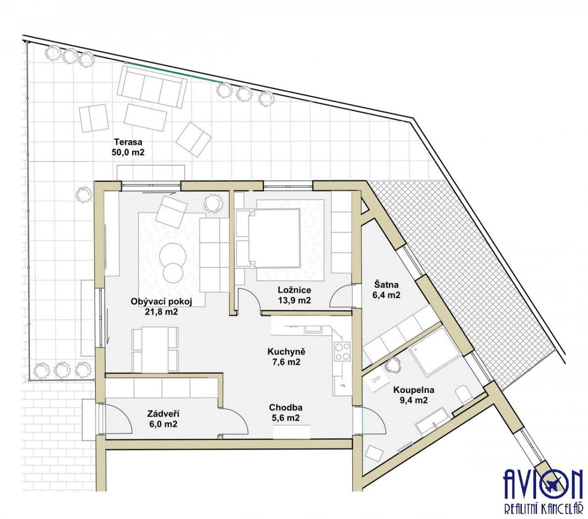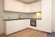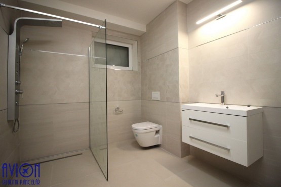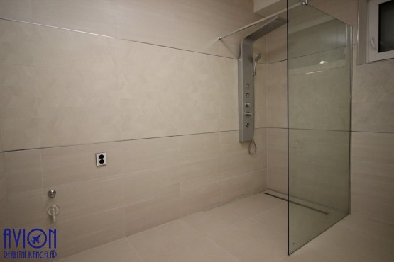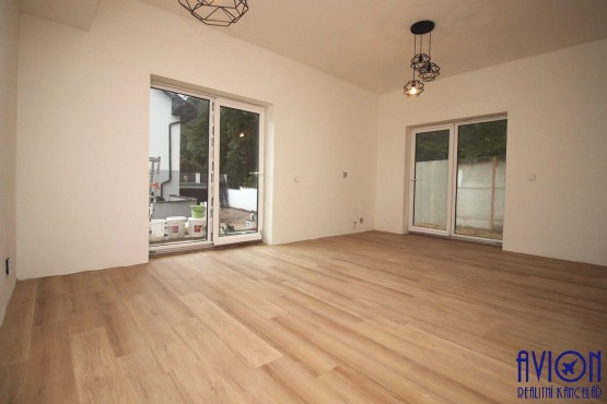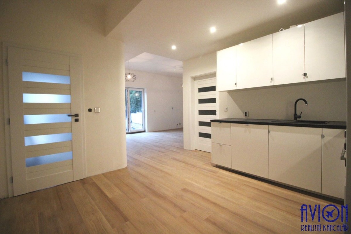 Byt má velký obývací pokoj o rozloze 22 m2 se vstupem na terasu, která bude (dokončuje se) oddělena dřevěnou zástěnou (viz ilustrační foto). Samostatný kuchyňský kout o rozloze 13 m2 je plně vybaven kuchyňskou linkou s vestavěnými spotřebiči (sporákem se sklokeramickou deskou, pečící troubou, lednicí a myčkou). Velká koupelna s walk - in sprchovým koutem, připojením na pračku a závěsným sociální zařízení WC, má rozlohu 9 m2. Ložnice o rozloze 14 m2 je vstup do samostatné šatny 6 m2. Na podlahách se nachází kvalitní vinyl, v koupelně a zádveří je dlažba. Byt má okna s trojitým sklem, v celém bytě je tepelně izolovaná podlaha s podlahovým vytápěním (společný kotel pro celý objekt).